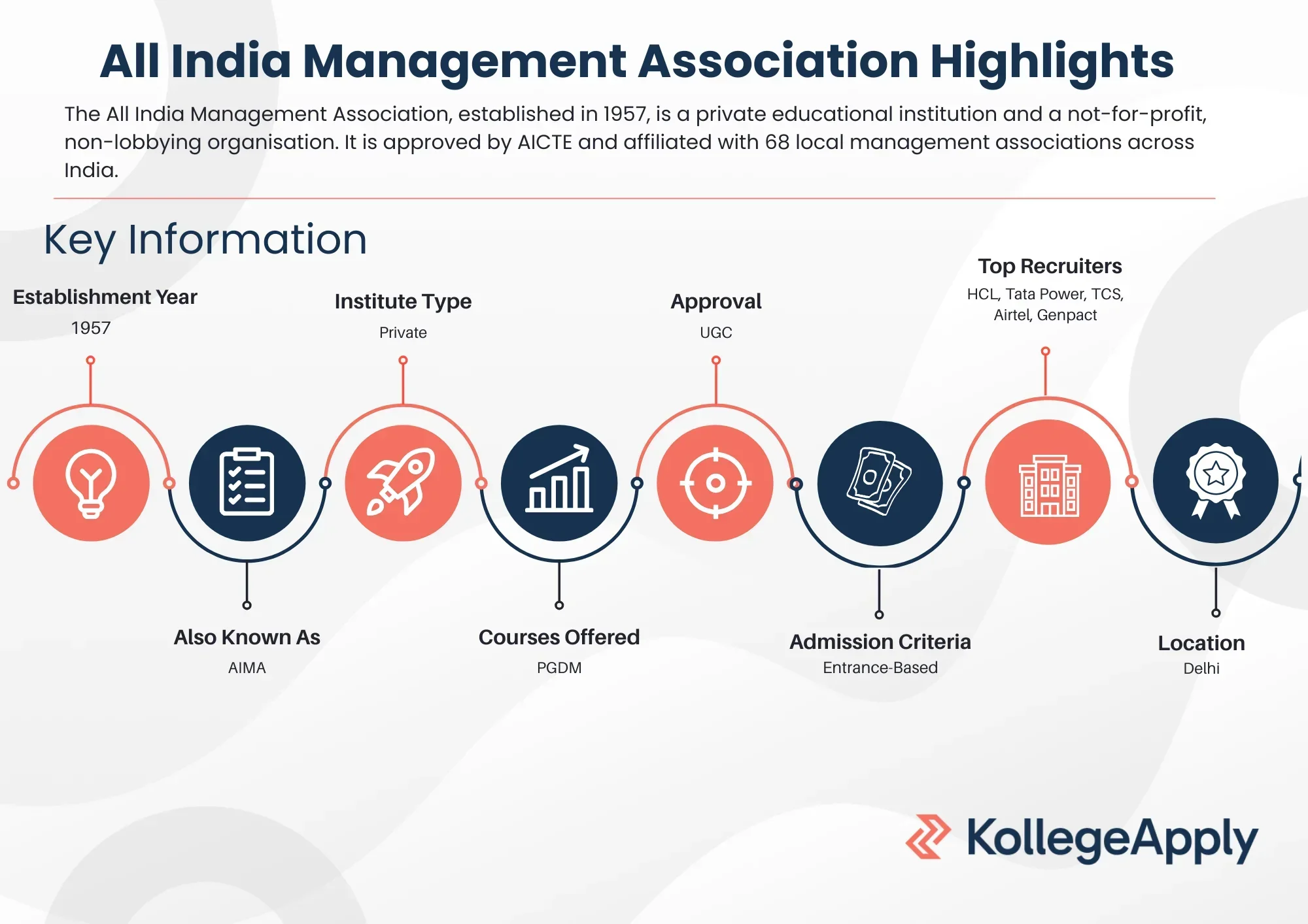 The All India Management Association, established in 1957, is a private educational institution and a not-for-profit, non-lobbying organisation. It is approved by AICTE and affiliated with 68 local management associations across India.
