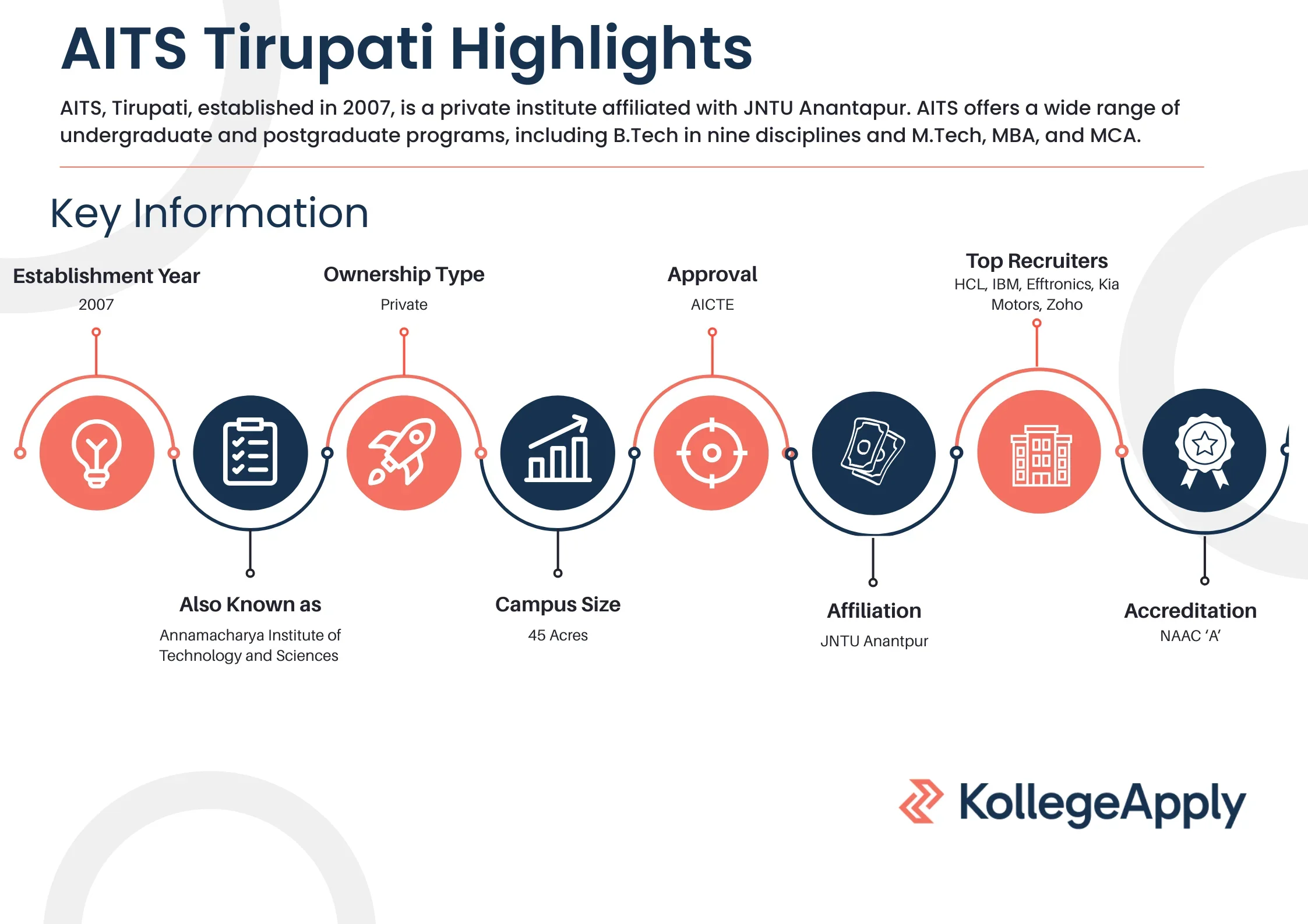 Annamacharya Institute of Technology and Sciences (AITS), Tirupati, established in 2007, is a private institute affiliated with JNTU Anantapur and approved by AICTE and UGC. Accredited with an "A" Grade by NAAC, AITS offers a wide range of undergraduate and postgraduate programs, including B.Tech in nine disciplines and M.Tech, MBA, and MCA, all in full-time mode. Admissions are entrance exam-based, with B.Tech applicants required to qualify AP EAMCET, M.Tech through AP PGECET, and MBA/MCA via AP ICET. Spread over a 45-acre campus at the foot of the Seven Hills, the institute provides modern infrastructure with well-equipped labs, smart classrooms, Wi-Fi, hostels, a library, sports facilities, and a gym. AITS also boasts a dedicated placement cell, connecting students with top recruiters like Hyundai, HCL, IBM, and Kia Motors through training programs, mock tests, and career workshops.