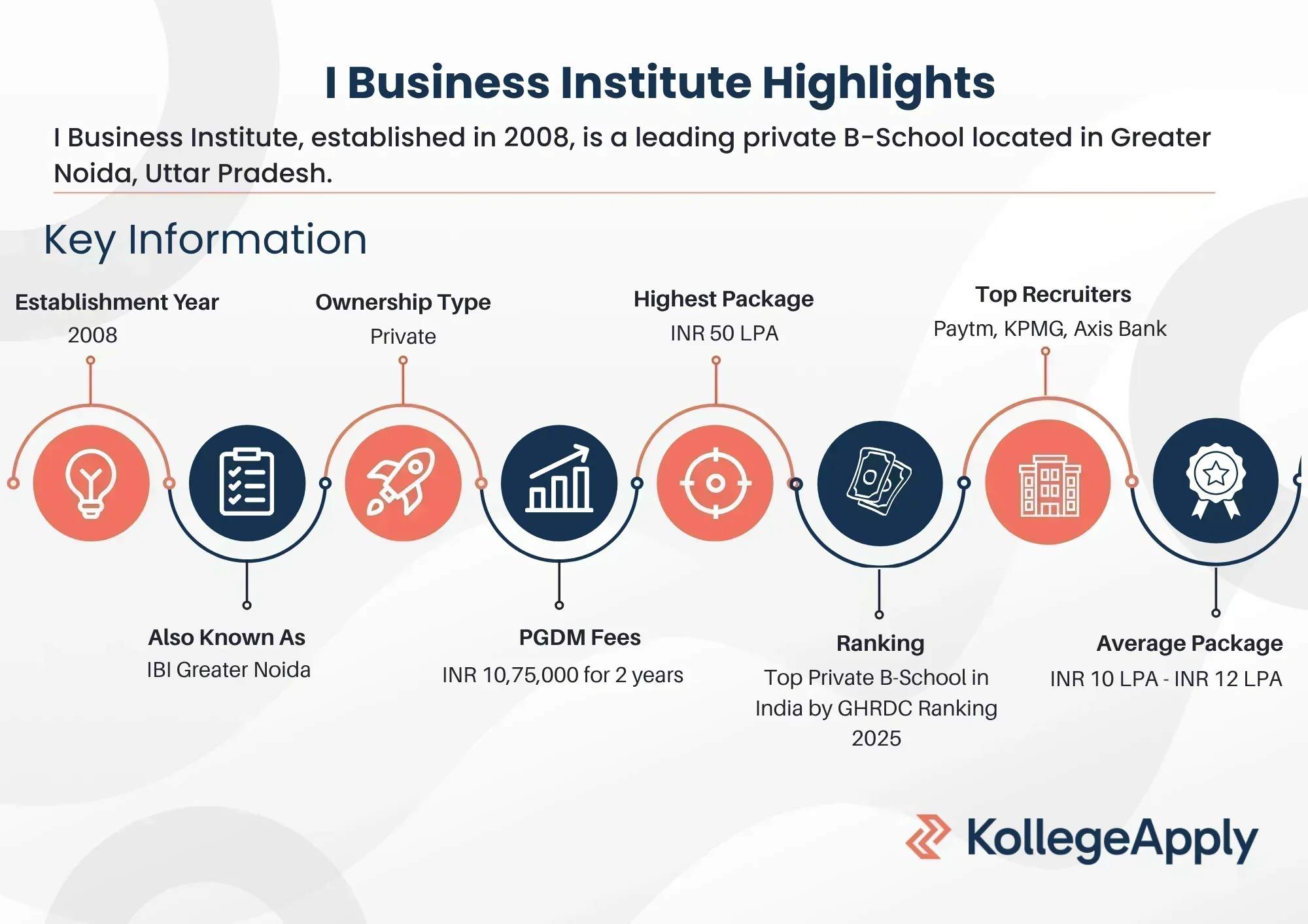 I Business Institute (IBI Greater Noida) is a private B-School approved by the Ministry of Education, AICTE, BGA - AMBA and QACS International. The I Business Institute was established in 2008 and is a member of NHRDN, NIPM, IIC, AIMA and CEGR. I Business Institute offers a PGDM course in 8 different specializations.