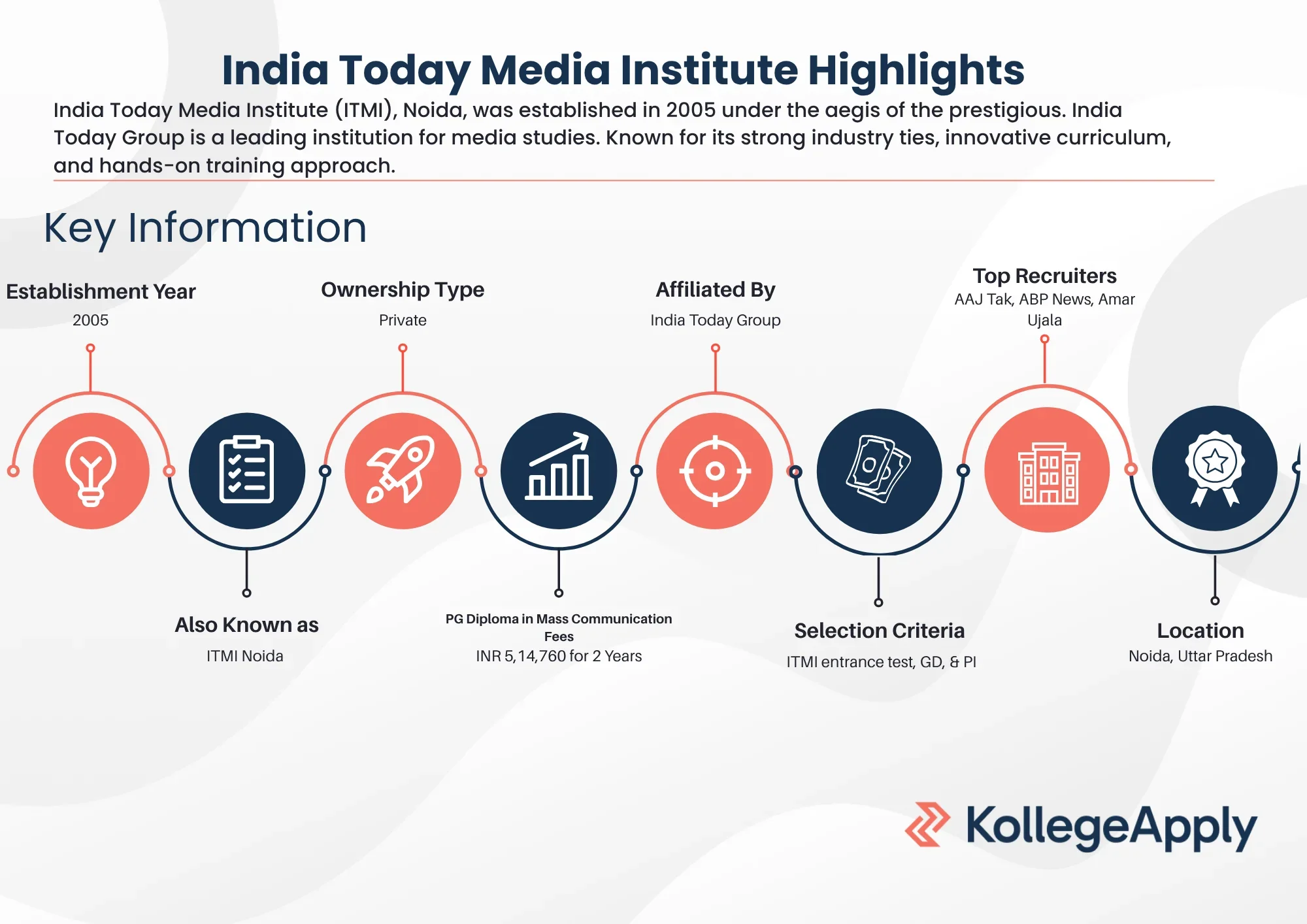 India Today Media Institute (ITMI), Noida, offers specialised postgraduate diploma and certification programs in media and communication fields such as Broadcast Journalism, Digital Media & Communication, and Mass Communication. With fees ranging from INR 3,30,680 to INR 5.14 lakhs, ITMI provides affordable yet industry-focused education designed to equip students with practical skills through hands-on training, internships, and expert faculty guidance. Admission is based on the ITMI Admission Test, Group Discussion, and Interview.