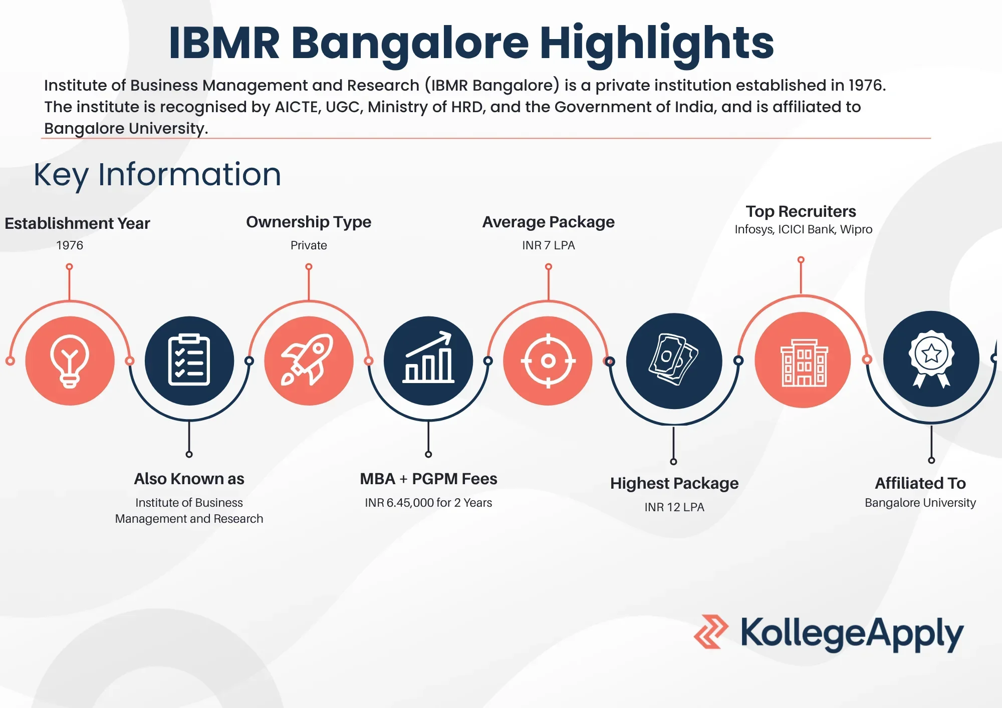 IBMR Bangalore provides all facilities like a library with national and international resources, a fully Wi-Fi-enabled campus, digital classrooms, and sports facilities, along with other amenities. It offers courses like MBA+PGPM and MCA+PGPIT. Admissions are based on entrance exams, such as CAT, MAT, XAT, ATMA, PGCET and KMAT, followed by a Group Discussion (GD) and a Personal Interview (PI).The fees for the MBA+PGPM course is INR 6,45,750 for two years. IBMR Bangalore also maintains a strong placement record. For the 2024 batch, the highest package offered was INR 12 LPA.
