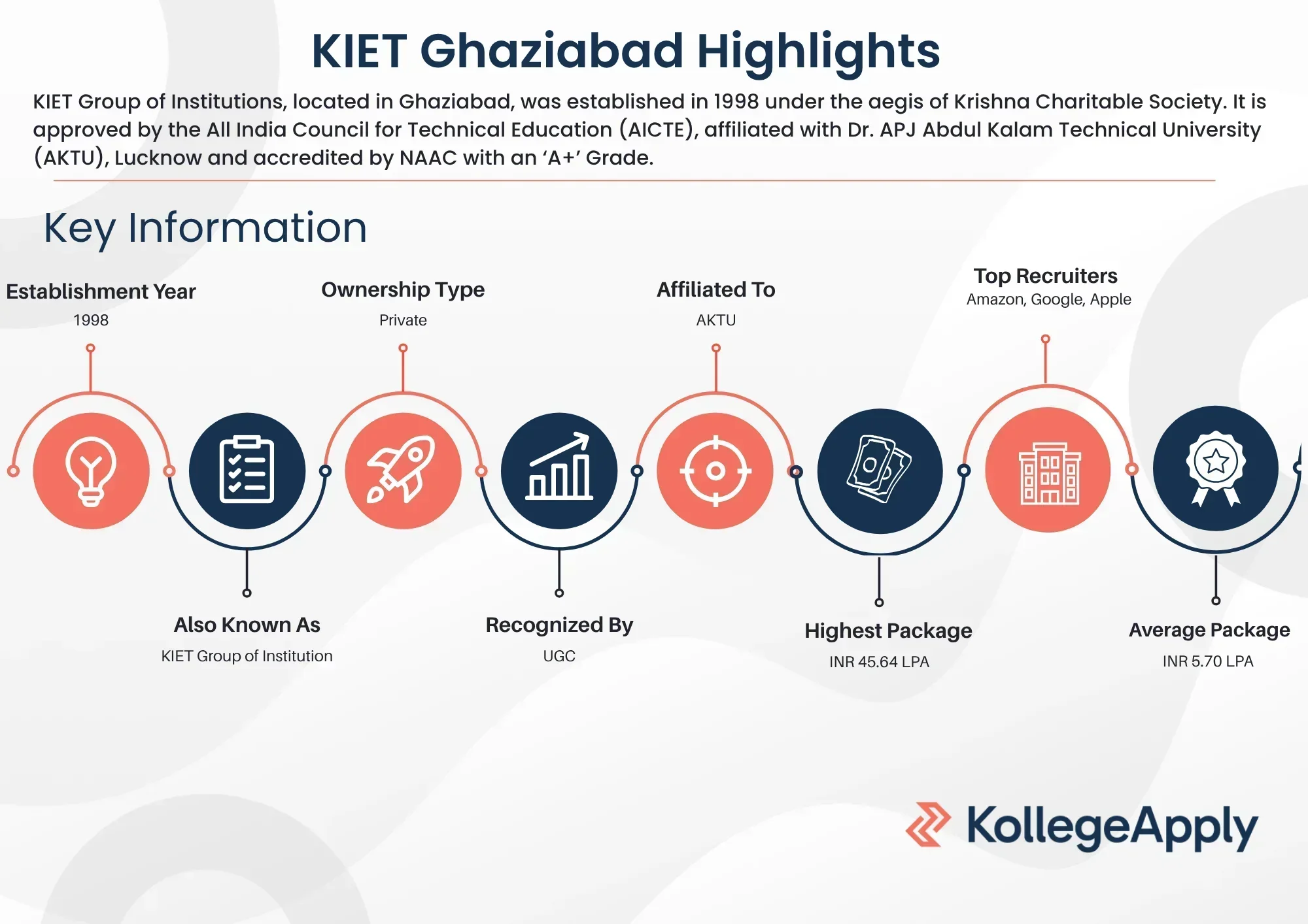 The official 2025 placement report for the KIET Ghaziabad has been released. The highest package offered was INR 45.64 LPA (IT), and the average package stood at INR 5.70 LPA(IT). Some of the top recruiters at KIET Ghaziabad include Accenture, Meta, Amazon, Google, Apple, Microsoft, Netflix, HCL, Wipro and more.