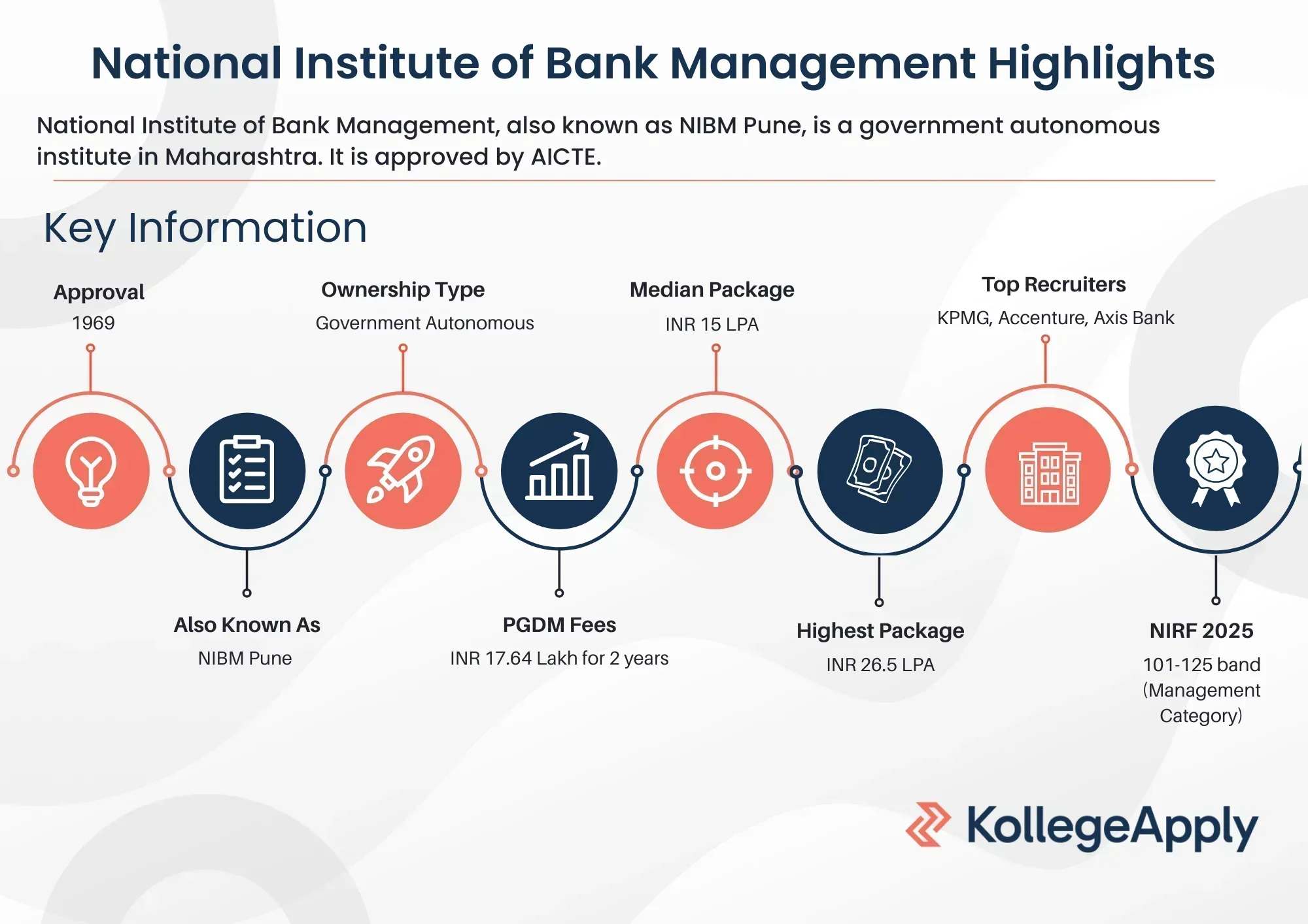 National Institute of Bank Management (NIBM Pune) is an autonomous apex institution located in Maharashtra. It was founded in 1969 by the Reserve Bank of India with support from the Indian government. NIBM Pune was ranked in the 101-125 band (Management category) by NIRF in 2025. The institute is approved by AICTE and offers a Post Graduate Diploma in Management in Banking and Financial Services (PGDM BFSI).