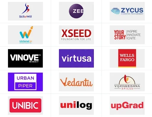 General Mills, Tata Consultancy Services, Wipro, Hershey (The Hershey Company), HP, Tata Advanced Systems, Google, SunPower Dubai, Flipkart, Bosch, Axis Bank, Excelacom, Brillio, SAP, Kaseya, Nestlé, PwC, Innoviti, DHL, Infosys, Polestar, XSEED Foundation for Life, ICICI Bank, etc.