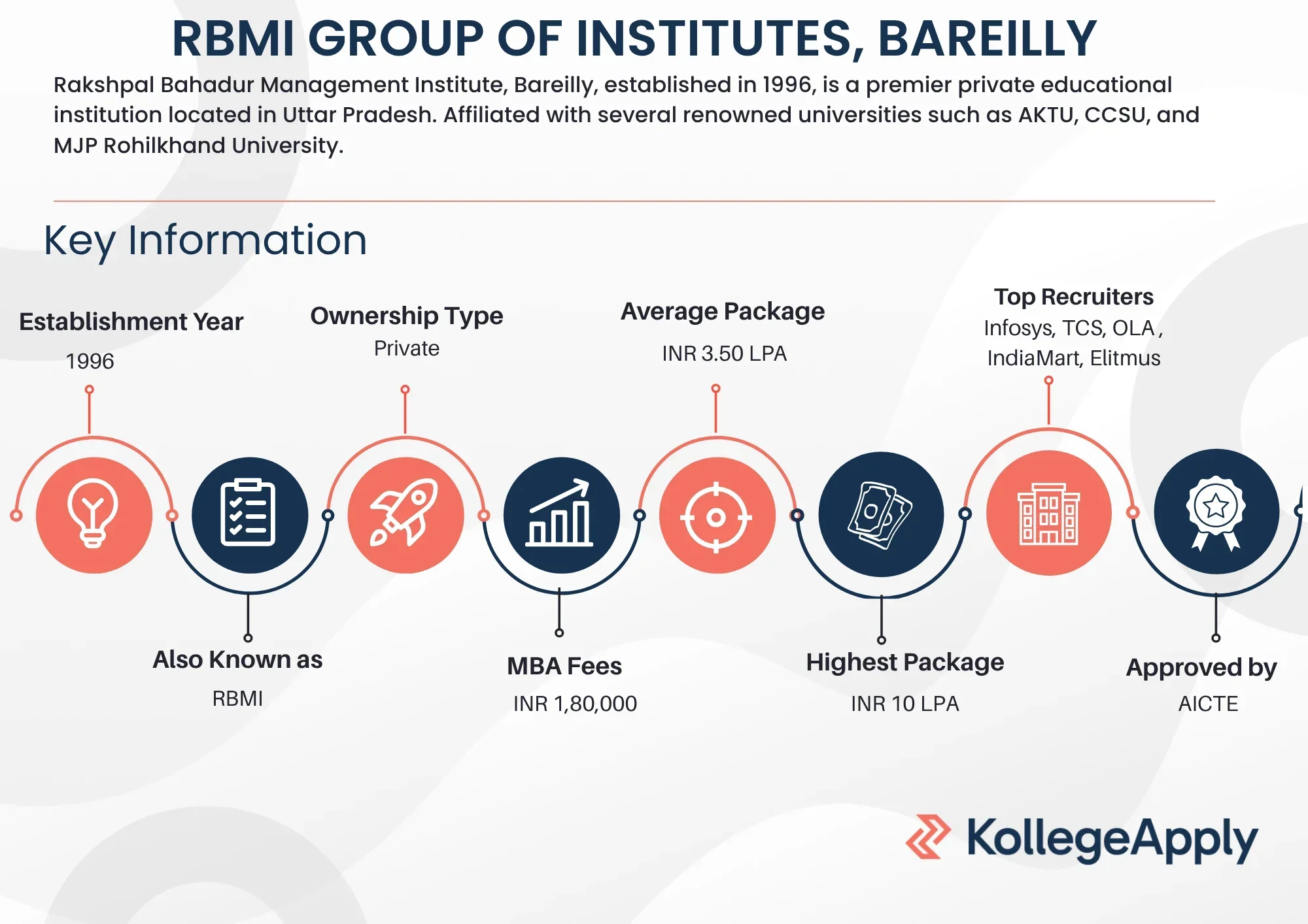 RBMI Bareilly offers placement assistance with an average package of INR 3.50 LPA and the highest package going up to INR 10 LPA. Some of the recruiters include ICICI Pru, IndiaMART, Just Dial, and Infosys.