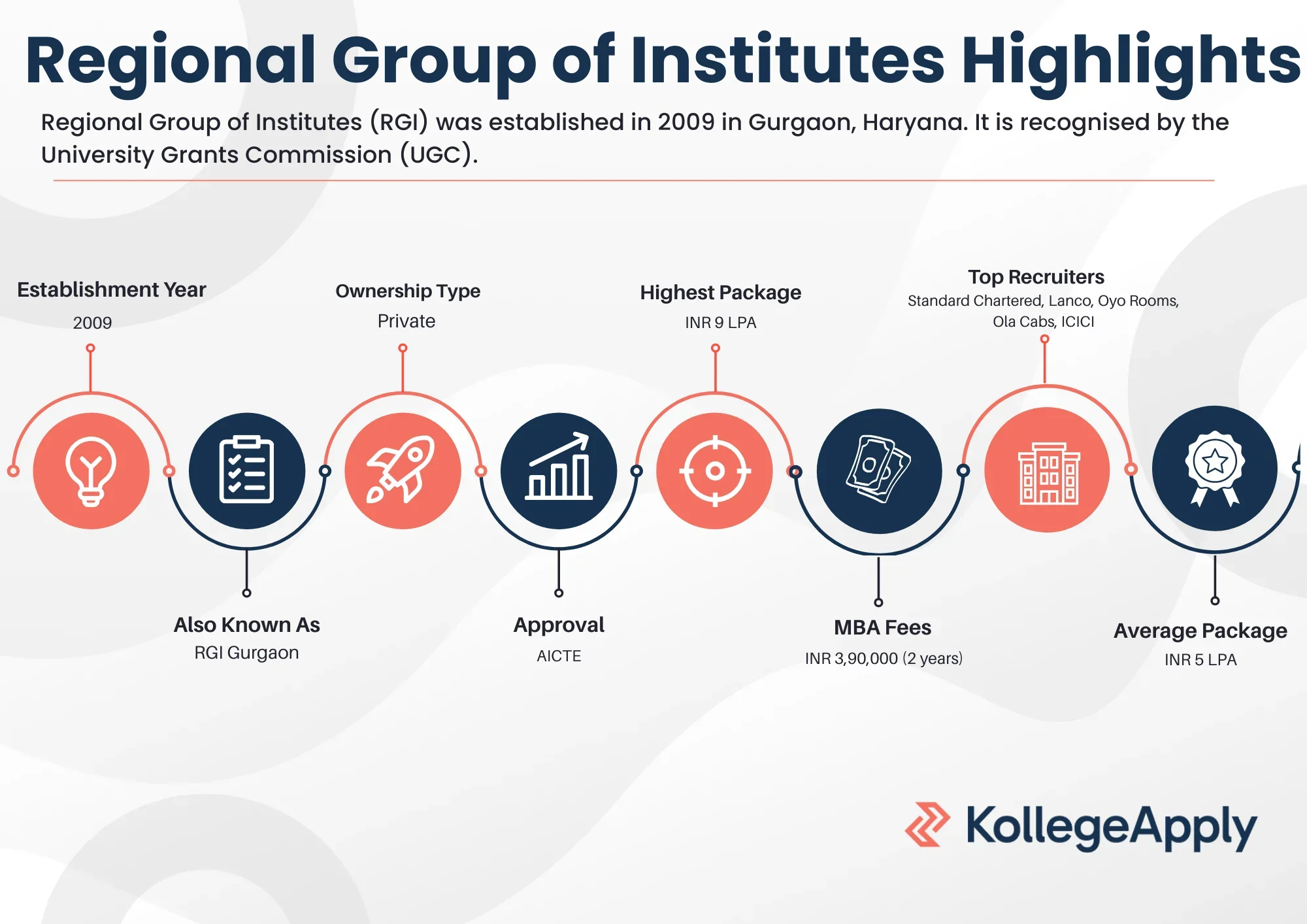 Regional Group of Institutes (RGI), located in Gurgaon, Haryana, was established in 2009 and is recognised by the University Grants Commission (UGC). RGI offers a full-time MBA program as well as a Post Graduate Program in Management combined. Students can choose from various specialisations, including Marketing, Finance, Human Resources (with certifications), and Supply Chain Management. The total fees for the two-year MBA program is INR 3,90,000 for two years. The different stages of the RGI Gurgaon admissions are based on merit and entrance exams, such as CAT / XAT / CMAT / GMAT, followed by a Group Discussion (GD), and a Personal Interview (PI).