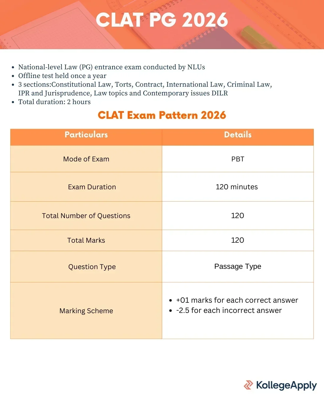 The CLAT PG 2026 exam will be held in pen-and-paper mode for a duration of 2 hours. The paper will include questions from Constitutional Law, other core law subjects, and contemporary legal issues.