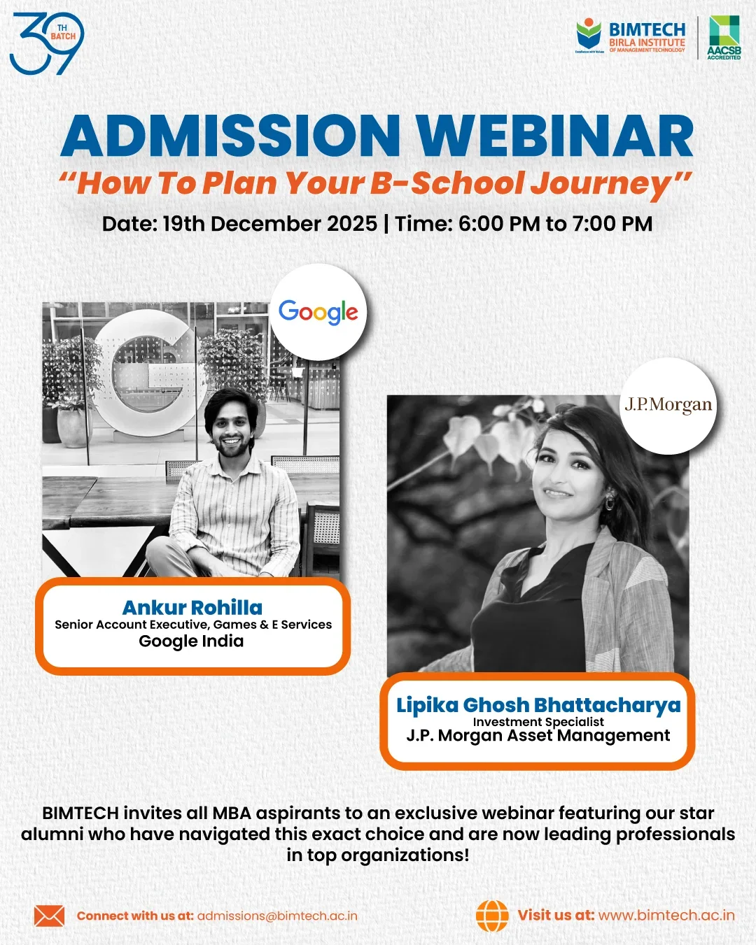 Birla Institute of Management Technology (BIMTECH) has invited MBA aspirants to an exclusive Admission Webinar where their distinguished alumni will share real-world insights on planning a successful B-School journey.