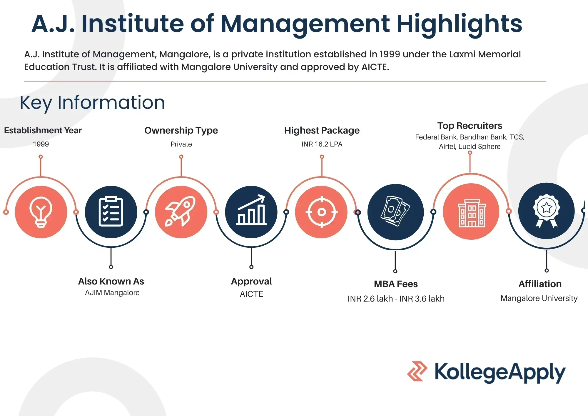 A.J. Institute of Management Studies Mangalore provides admission to its 2-year flagship MBA program in 6 specialisations: Financial Management, Human Resource Management, Marketing Management, Banking Management, Hospital Administration, and Logistics Management. To get admission, candidates must have completed their 10+2+3 or 10+2+4 or 10+2+5 pattern under any discipline, securing at least 50% marks in aggregate. Additionally, applicants are required to take the KMAT/CAT/MAT/CMAT entrance exams. The total fee for the program is around INR 2,60,000 for the government quota and INR 3,60,000 for the management quota. The following table represents an overview of the A.J. Institute of Management course and fees: