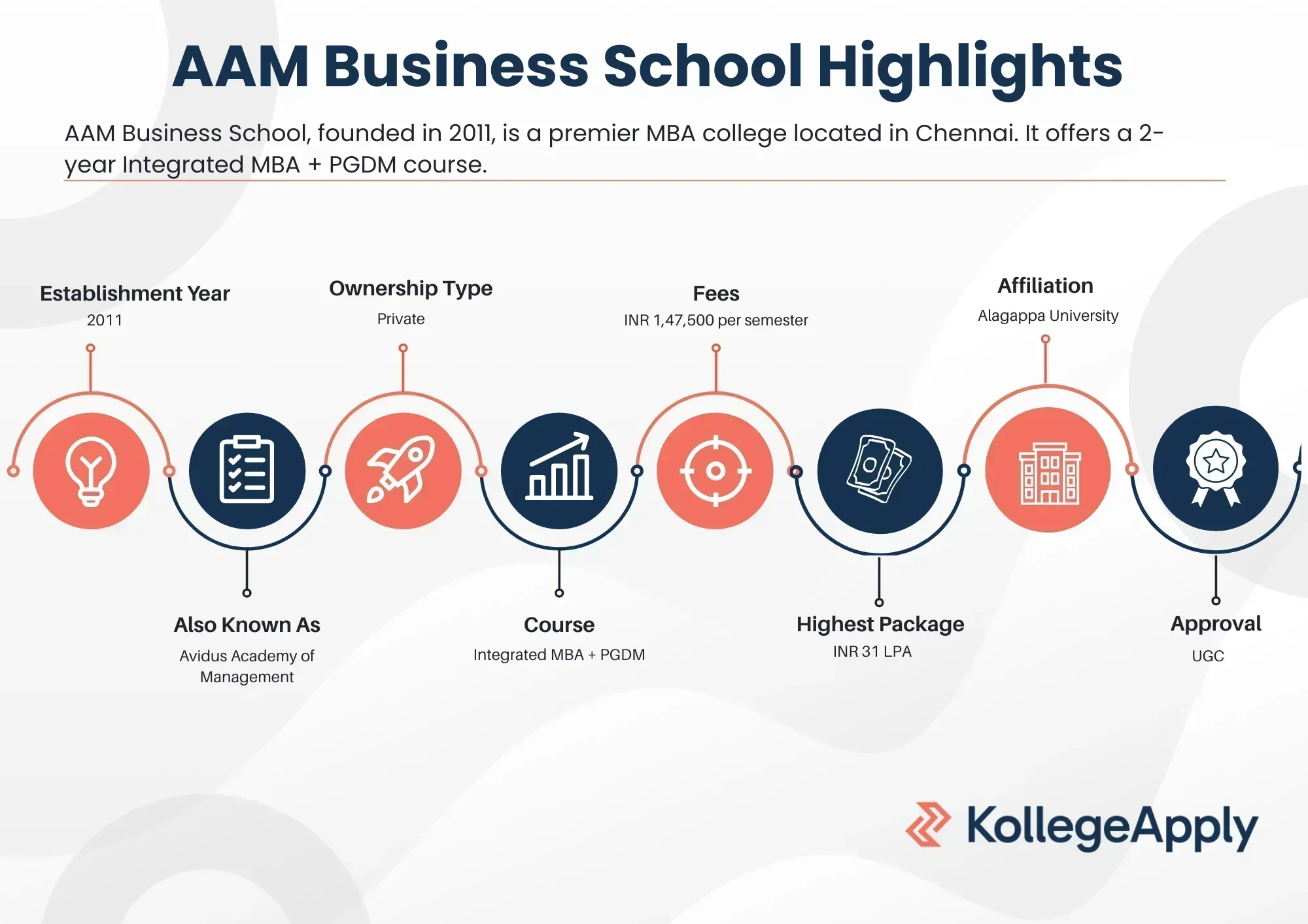 AAM Business School admission is based on merit, entrance exams such as TANCET, MAT or CAT, followed by an admission interview. Candidates must have completed a bachelor's degree from a recognised university. The AAM Business School fees for the MBA + PGDM integrated program is INR 1,47,500 per semester. Additionally, students from AAM Business School are placed in leading companies such as TCS, Hewlett Packard, HDFC, HSBC, Kotak Mahindra, Future Groups and Reliance. The highest package offered in the recent AAM Business School placement was INR 31 LPA.