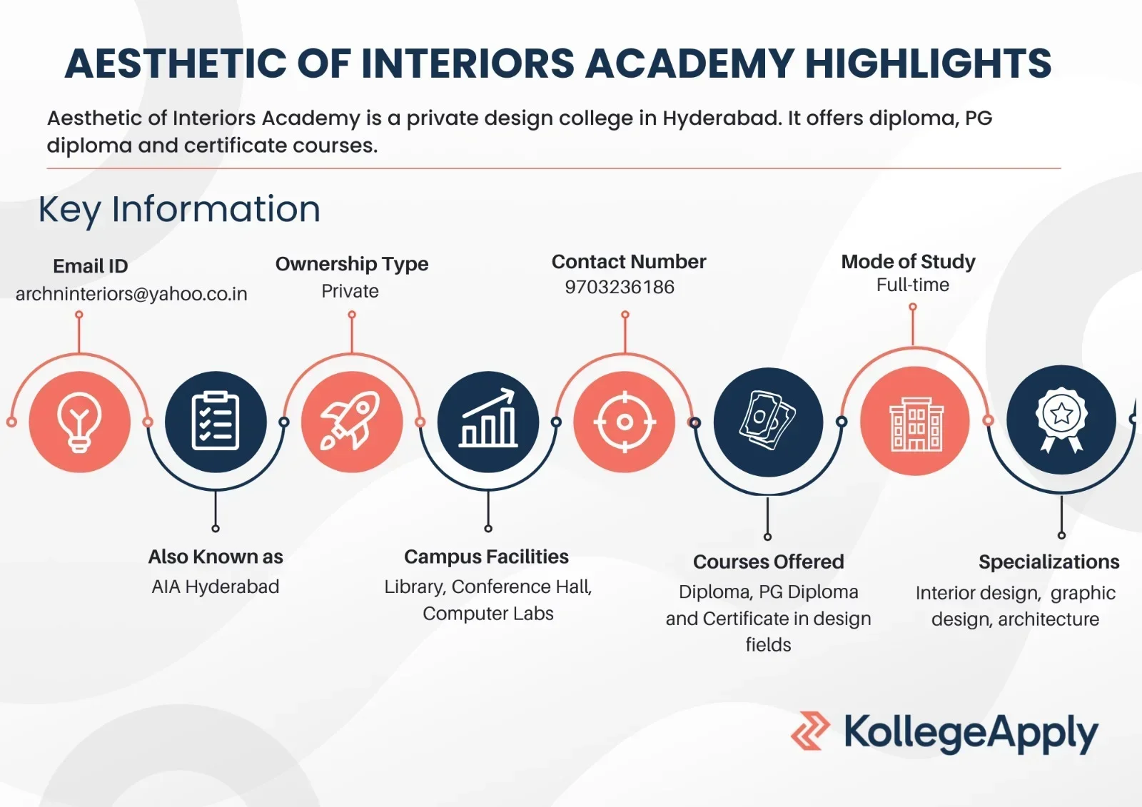 Aesthetic of Interiors Academy is a reputed private institute in Hyderabad, Telangana. The academy offers diploma, PG diploma and certificate courses in interior, architectural design, graphic design and related fields. The courses are open to students who have passed Class 10, 12 or Graduation, depending on the program. The admission is on a first-come, first-served basis and may require a portfolio.