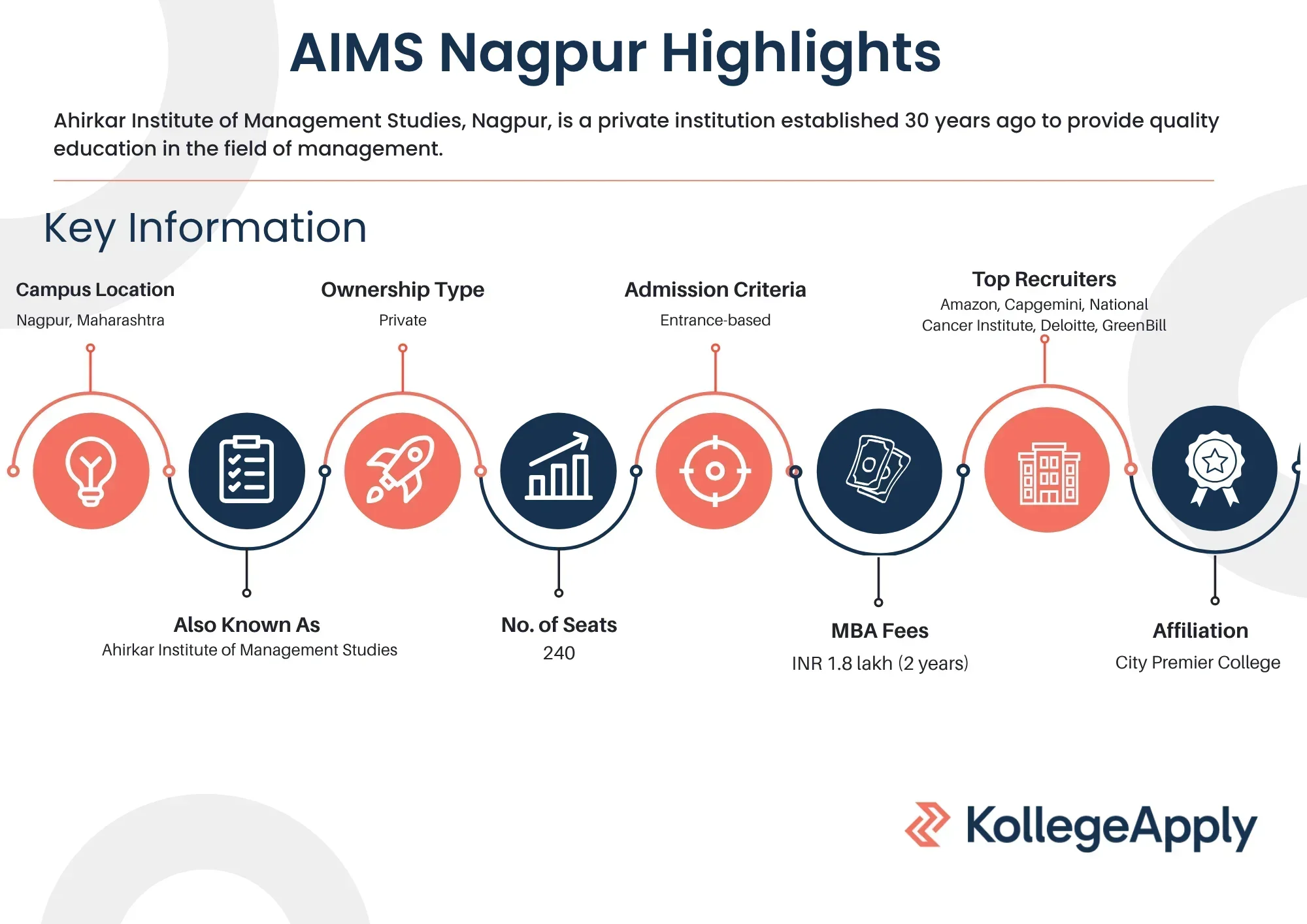 AIMS Nagpur (Ahirkar Institute of Management Studies) is a private institute located in Nagpur, Maharashtra. The college has been providing quality education to students in the discipline of Commerce and Management for approximately 30 years. AIMS Nagpur offers an MBA course in partnership with City Premier College at the PG level. The total seat intake for MBA is 240. AIMS Nagpur admission is based on a valid score in graduation and the MAH-CET, CAT or CMAT entrance exam. The total fees for the MBA program is INR 1.8 lakh for two years. Some of the leading companies that participate in AIMS Nagpur placements include Deloitte, Amazon, Capgemini, Flipkart, IBM, Concentrix and Infosys.