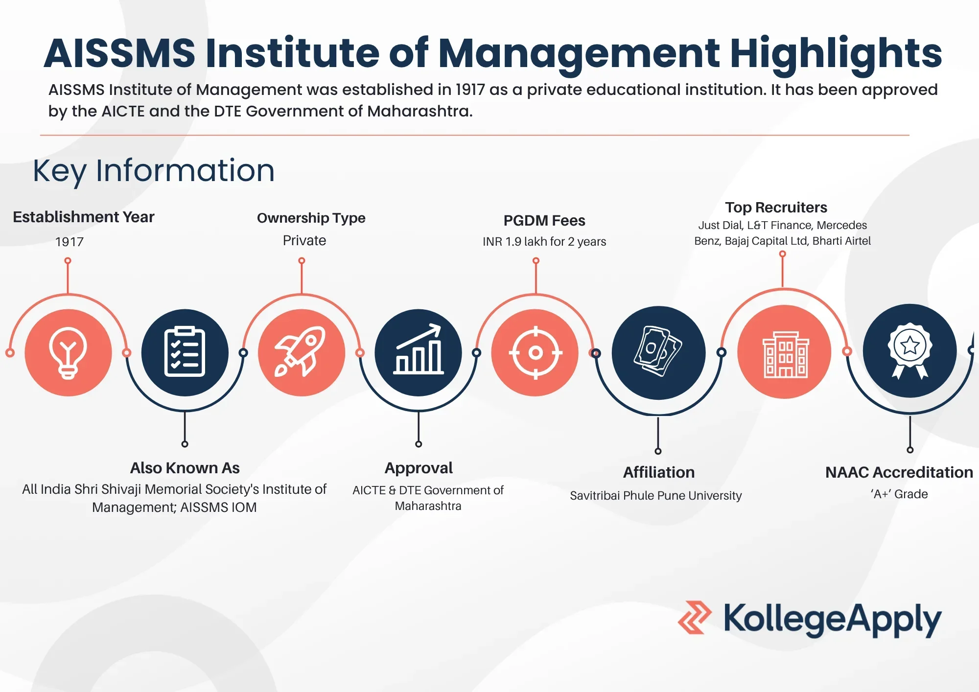 All India Shri Shivaji Memorial Society's Institute of Management (AISSMS IOM) was established in 1917 as a private educational institution. AISSMS Institute Maharashtra has been approved by the All India Council for Technical Education (AICTE) and the DTE Government of Maharashtra and is affiliated with Savitribai Phule Pune University. It is accredited by NAAC with an ‘A+’ Grade.