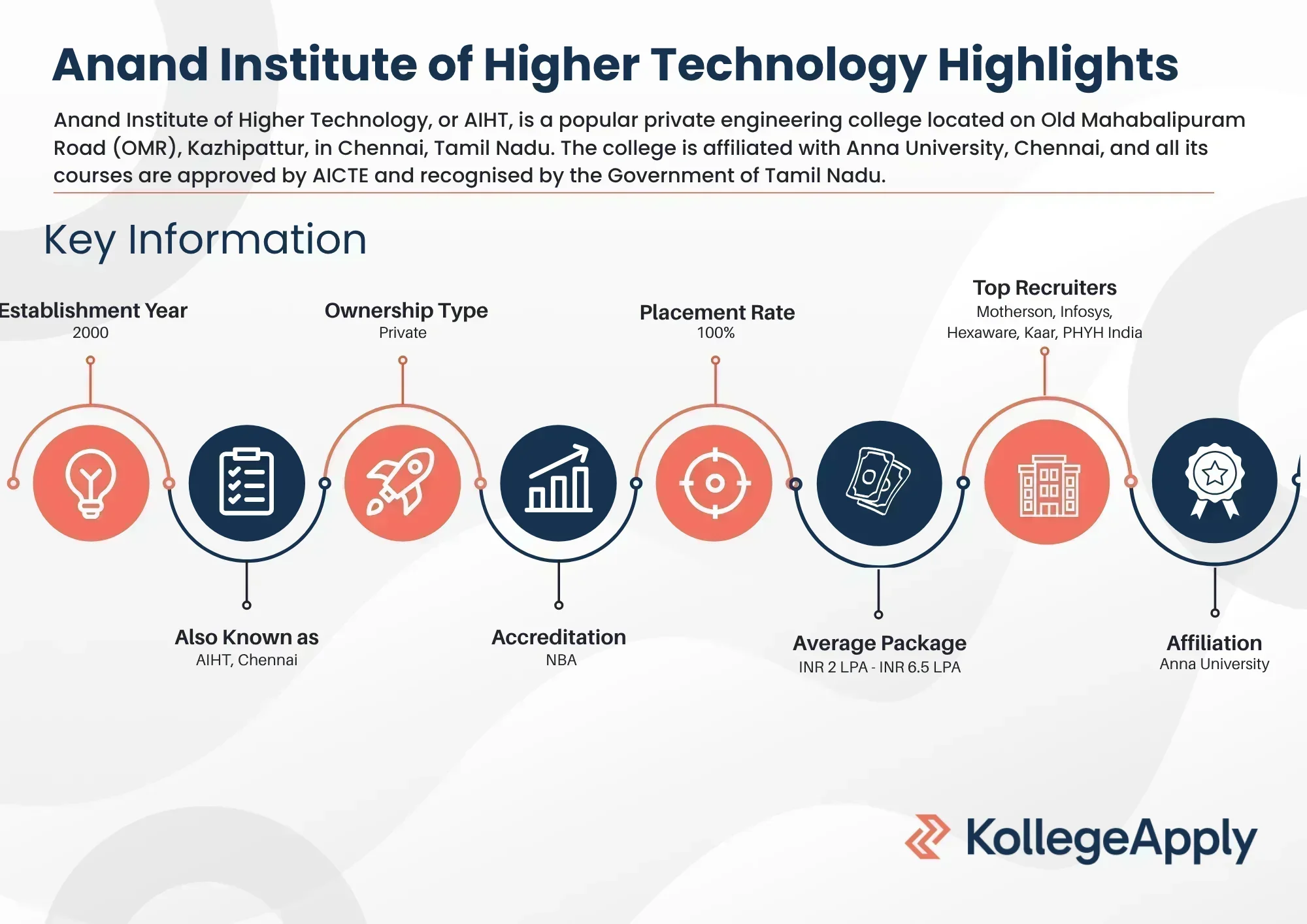 Anand Institute of Higher Technology, or AIHT, is a popular private engineering college located on Old Mahabalipuram Road (OMR), Kazhipattur, in Chennai, Tamil Nadu. It was started in 2000 by Kalvi Vallal Thiru T. Kalasalingam, who founded the Kalasalingam and Anand Educational Trust. The college is affiliated with Anna University, Chennai, and all its courses are approved by AICTE and recognised by the Government of Tamil Nadu. AIHT offers B.E. / B.Tech, M.E. / M.Tech, and MBA programs in branches like CSE, ECE, IT, EEE, Mechanical, Civil, and AI & DS.