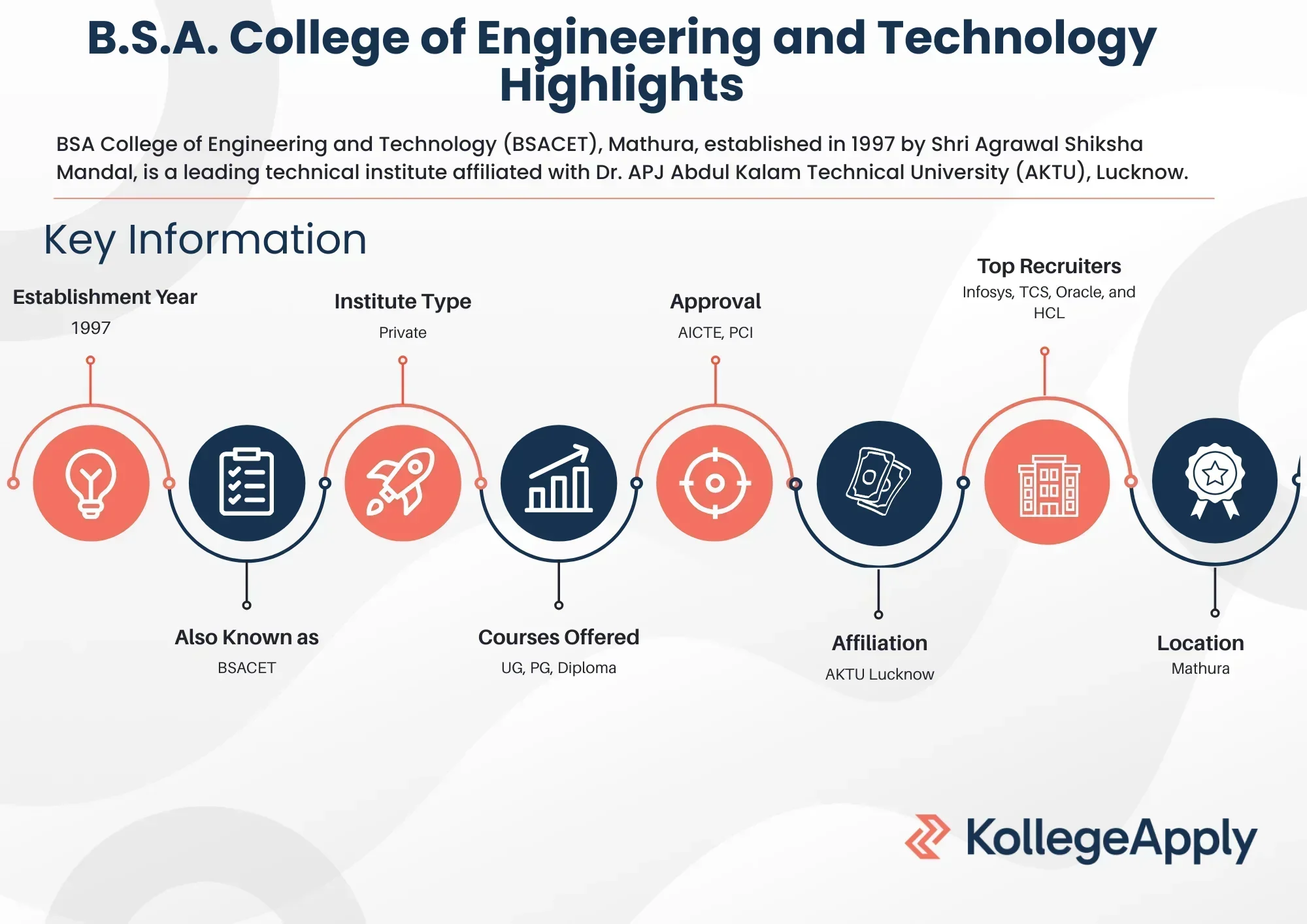 BSA College of Engineering and Technology (BSACET), Mathura, established in 1997 by Shri Agrawal Shiksha Mandal, is a leading technical institute affiliated with Dr. APJ Abdul Kalam Technical University (AKTU), Lucknow. Spread over 11.5 acres, the college offers AICTE and PCI-approved UG and PG programs in Engineering, Pharmacy, Management, and Computer Applications. Courses include B.Tech, B.Pharm, BBA, BCA, MBA, MCA, and Diploma programs. Admission to B.Tech is based on JEE Main/UPTAC, and PG programs, such as MBA/MCA, follow UPTAC counselling. Annual fees for B.Tech and MBA are around INR 75,000, while diploma courses start at INR 30,150 per year. In past placement drives, top companies such as Infosys, TCS, Oracle, and HCL have hired students across various departments. The campus offers hostel facilities, a digital library, labs, tech events such as Arunima and Techfest, and scholarships in accordance with UP government norms.