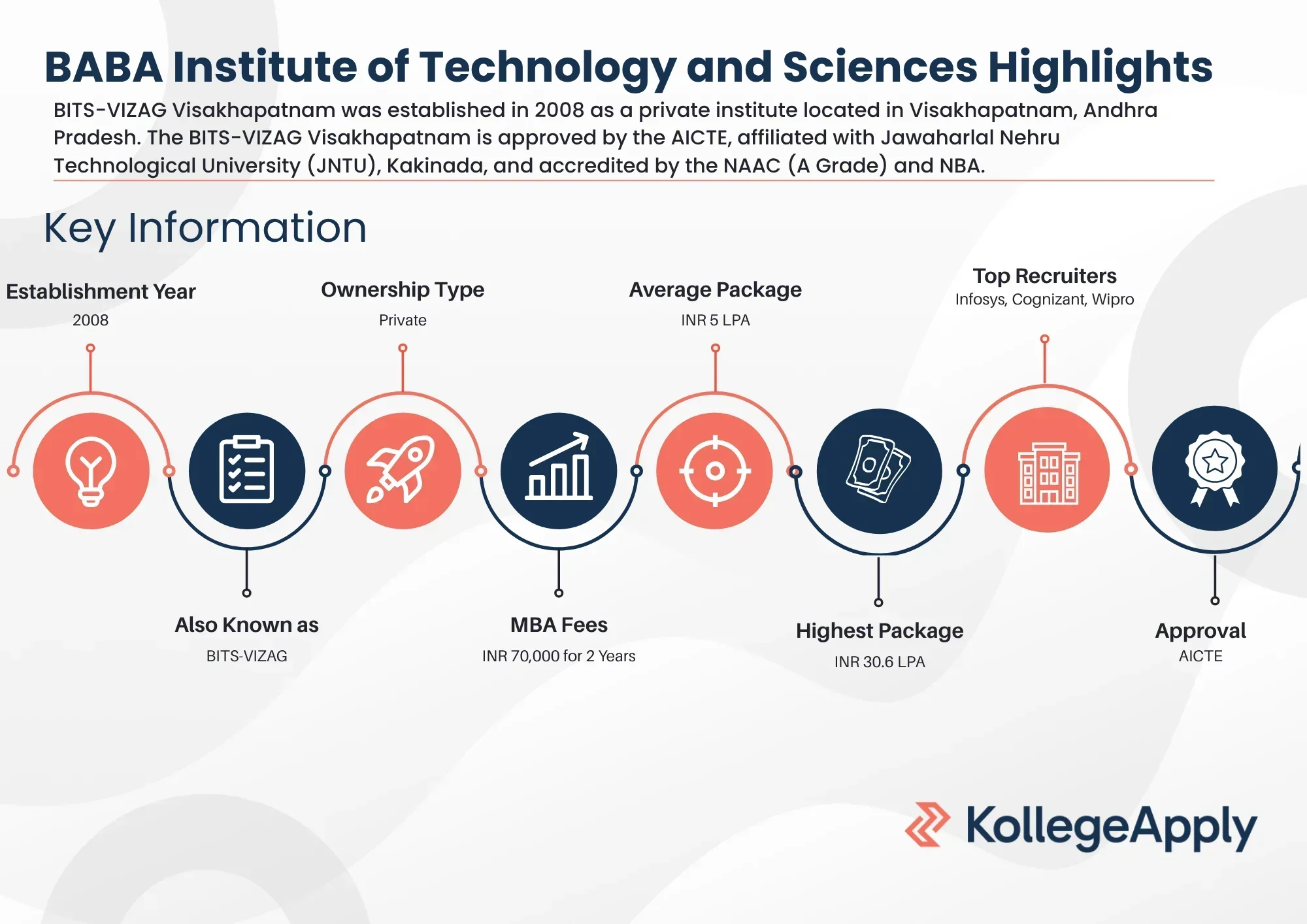 BITS-VIZAG Visakhapatnam was established in 2008 as a private institute located in Visakhapatnam, Andhra Pradesh. The BITS-VIZAG Visakhapatnam is approved by the AICTE, affiliated with Jawaharlal Nehru Technological University (JNTU), Kakinada, and accredited by the NAAC (A Grade) and NBA. BITS-VIZAG Visakhapatnam offers an undergraduate program in B.Tech with a seat intake of 60-180, depending on the specialisation. The annual course fee is INR 40,000. PG courses offered at BITS-VIZAG, Visakhapatnam, are M.Tech and MBA with specialisation in various fields. The seat intake was 18 for each specialisation for MBA and 60 for MBA.
