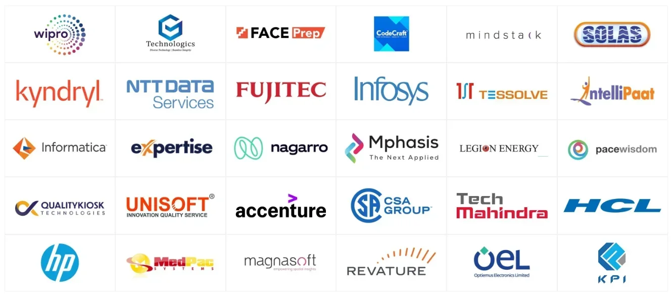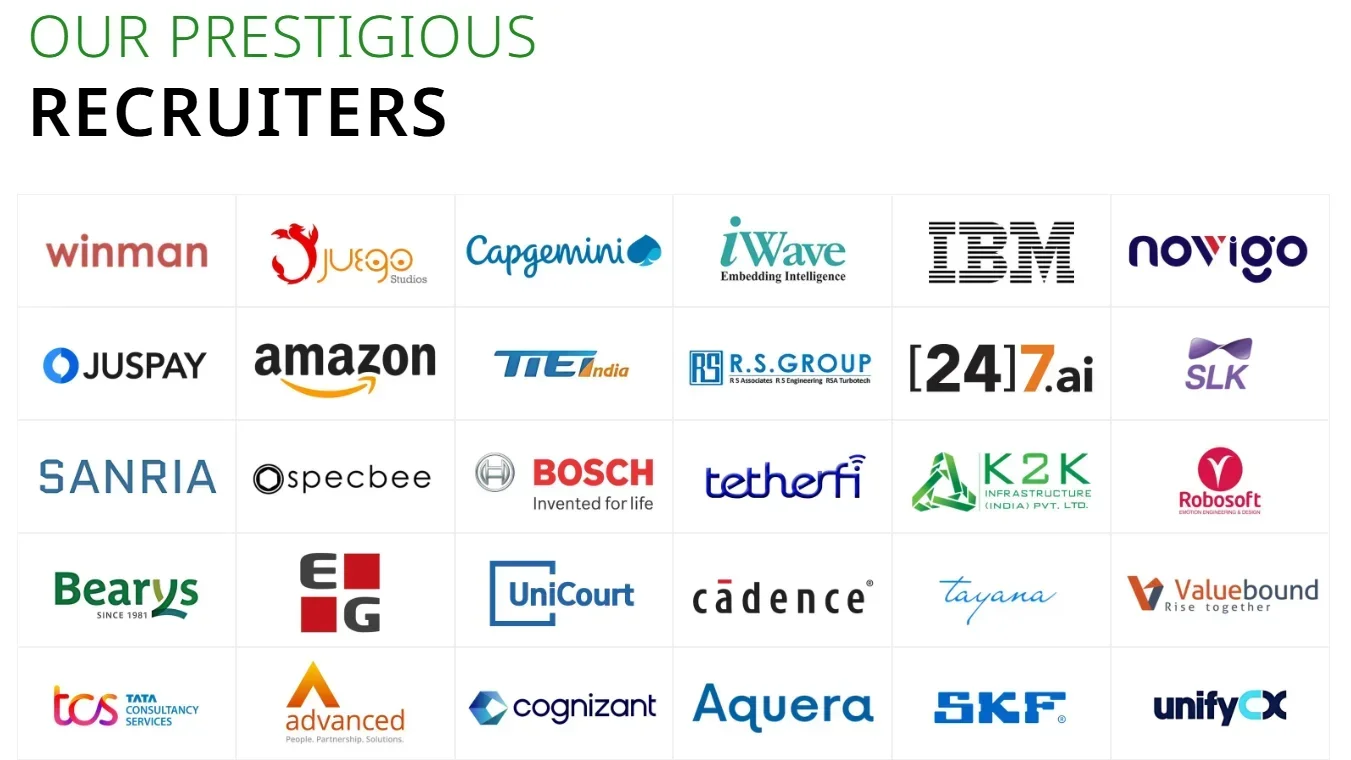 Top recruiters include Infosys, Cognizant, Wipro, TCS, Mphasis, Capgemini, Bosch, IBM, HP, and the Indian Navy.