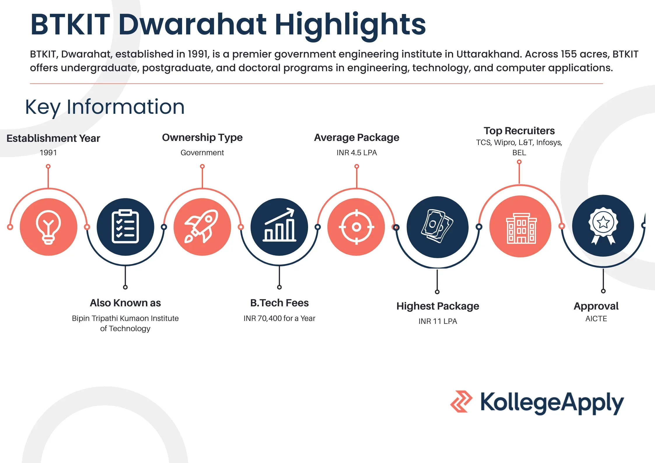 Bipin Tripathi Kumaon Institute of Technology, Dwarahat, established in 1991, is a premier government engineering institute in Uttarakhand. Across 155 acres, BTKIT offers undergraduate, postgraduate, and doctoral programs in engineering, technology, and computer applications. The AICTE approves the institute, and it was formerly affiliated with UTU, Dehradun. It operates as an autonomous institution under the Government of Uttarakhand, managed by a Board of Governors chaired by the state’s Minister of Technical Education. BTKIT’s academic programmes and institutional operations are regularly reviewed and approved by the Uttarakhand state government. The campus features modern infrastructure, including Wi-Fi, laboratories, hostels, sports facilities, and a library, fostering a holistic educational environment. BTKIT is recognised for its affordable fee structure, government support, and consistent placement opportunities for its students.