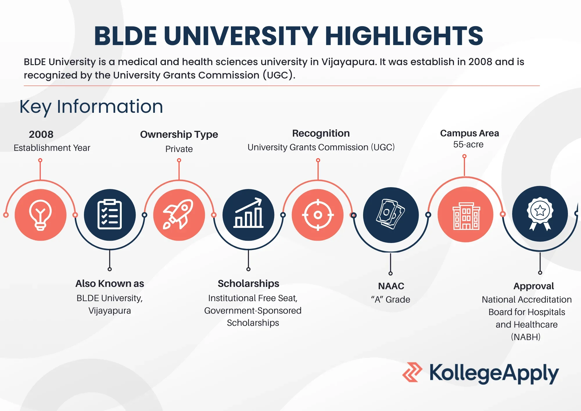 BLDE University, Vijayapura, provides various institutional and government scholarships to students enrolled in its programs. Students can contact the University Administration Office to get details about these scholarships. Documents like marksheets and income/category certificates may be required during the process.