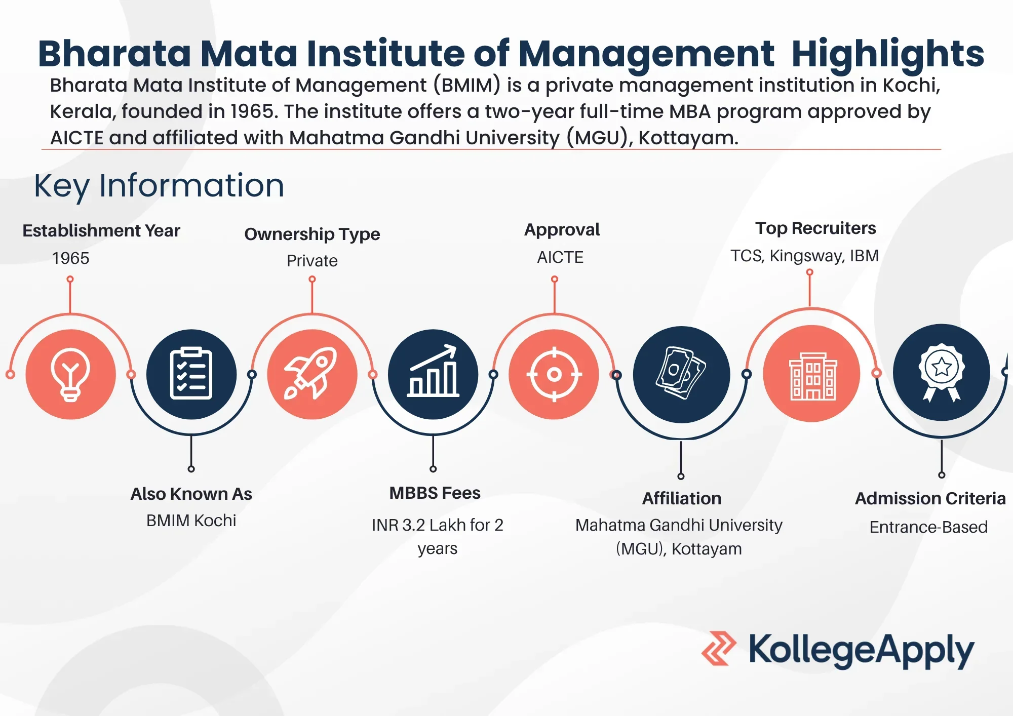 Bharata Mata Institute of Management (BMIM) is a private management institution in Kochi, Kerala, founded in 1965. The institute offers a two-year full-time MBA program approved by AICTE and affiliated with Mahatma Gandhi University (MGU), Kottayam. The MBA program at BMIM includes core specialisations in Finance, Marketing and Human Resource Management. The flagship MBA program has a fee of INR 3.20 lakh for a 2-year duration. Candidates must pass their graduation with at least 50% marks (45% for SC/ST). The final selection is based on entrance exam scores (CMAT, CAT, MAT and KMAT), followed by a personal interview (PI) and a group discussion (GD) round.