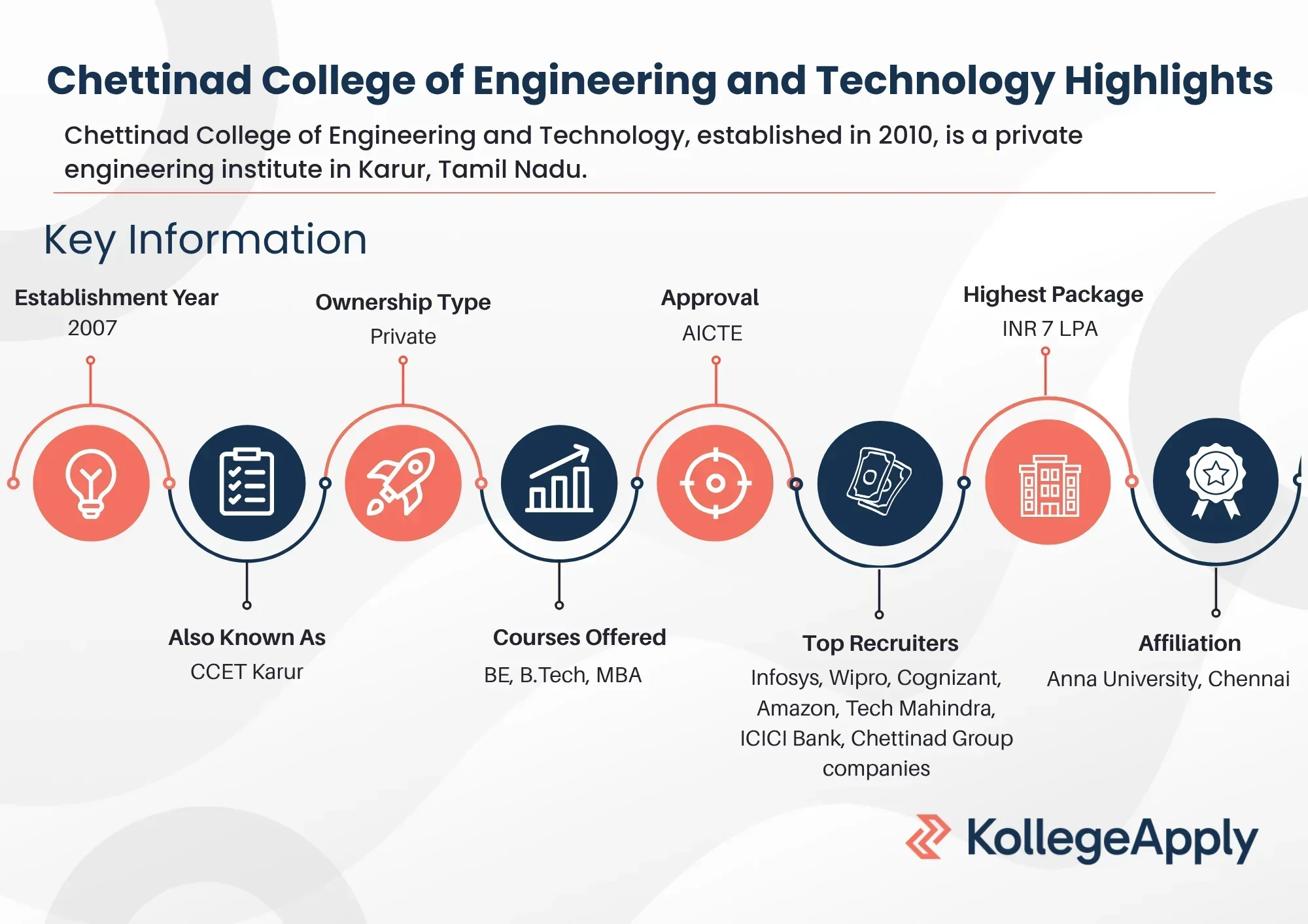Chettinad College of Engineering and Technology provides complete placement assistance to the students. The highest package offered is INR 7 LPA. Top recruiters here include Infosys, Wipro, Cognizant, Amazon, Tech Mahindra, ICICI Bank and TVS. The 120-acre college campus has a well-stocked library, sports infrastructure and hostel facilities.