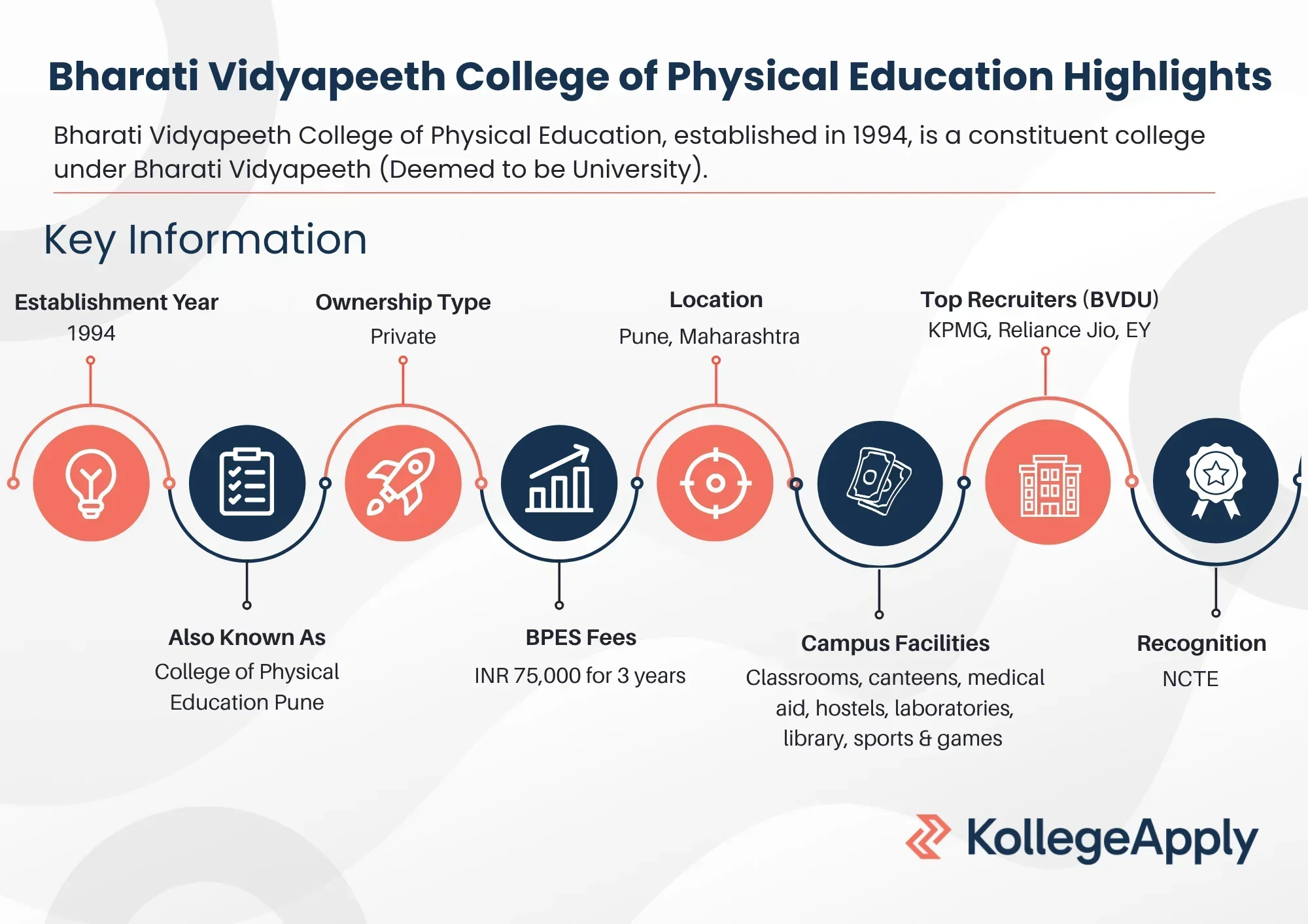Bharati Vidyapeeth College of Physical Education offers career counselling and internship programs to its students. KPMG, Reliance Jio, Axis Bank, EY and Aditya Birla Group are among the top recruiters at Bharti Vidyapeeth. The 1973.79 sq. m. campus has classrooms, canteens, medical aid, hostels, laboratories, library, sports and games facilities.