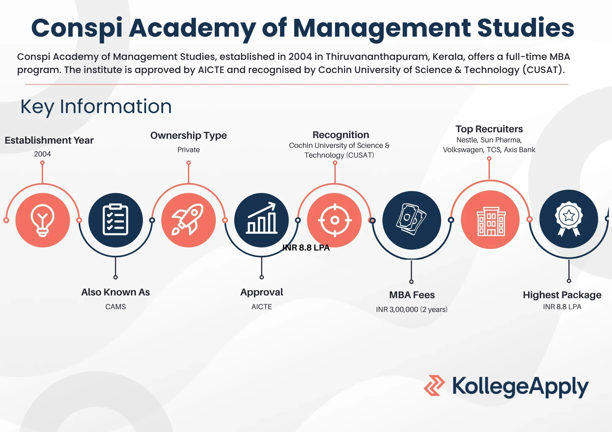 Conspi Academy of Management Studies, established in 2004 in Thiruvananthapuram, Kerala, offers a full-time MBA program. The institute is approved by the All India Council for Technical Education (AICTE) and recognised by Cochin University of Science & Technology (CUSAT). Admissions are based on entrance exams, such as CAT, MAT or CMAT, followed by a Group Discussion (GD) and a Personal Interview (PI). The total fee for the MBA program is approximately INR 3 lakh for two years.