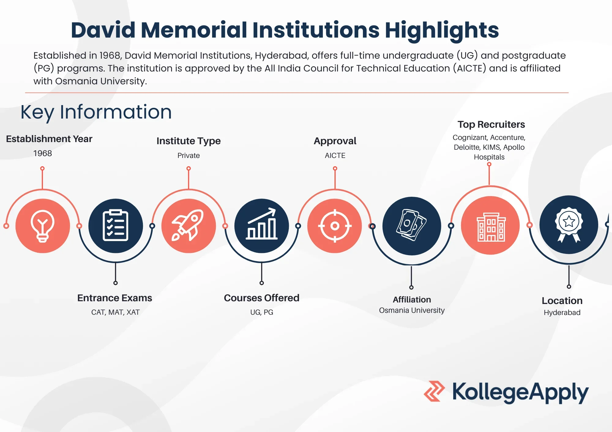 Established in 1968, David Memorial Institutions, Hyderabad, offers full-time undergraduate (UG) and postgraduate (PG) programs. The institution is approved by the All India Council for Technical Education (AICTE) and is affiliated with Osmania University.