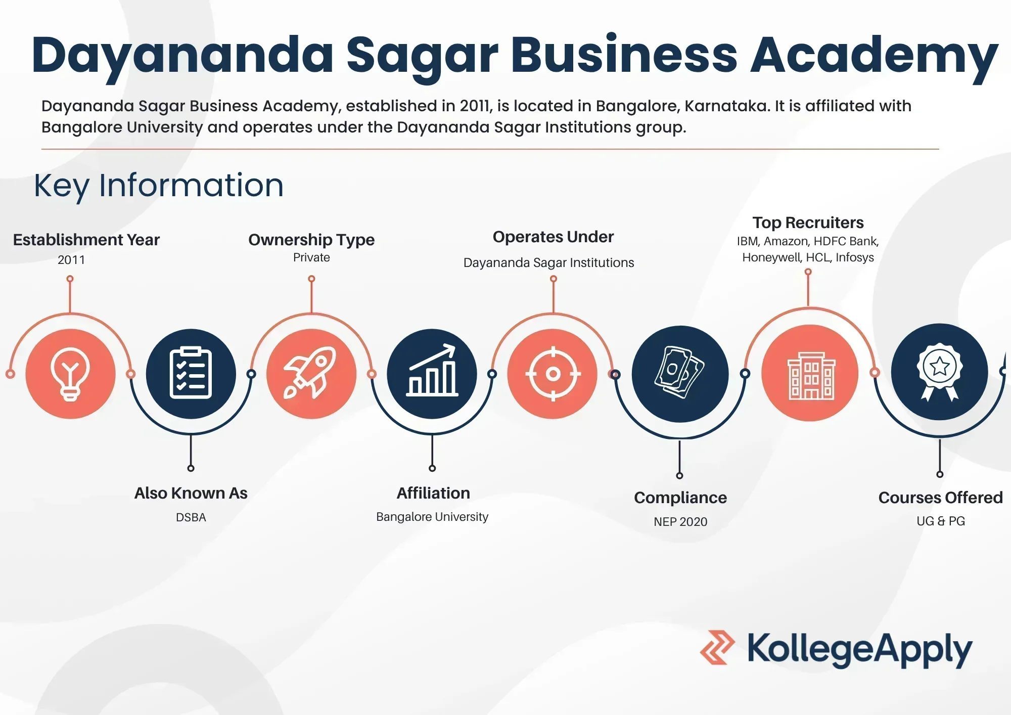 Dayananda Sagar Business Academy (DSBA), established in 2011, is located in Bangalore, Karnataka. It is affiliated with Bangalore University and operates under the Dayananda Sagar Institutions group. DSBA offers undergraduate courses including BBA, B.Com, and BCA, as well as a postgraduate M.Com degree. All programs at DSBA are structured in accordance with the National Education Policy (NEP) 2020.