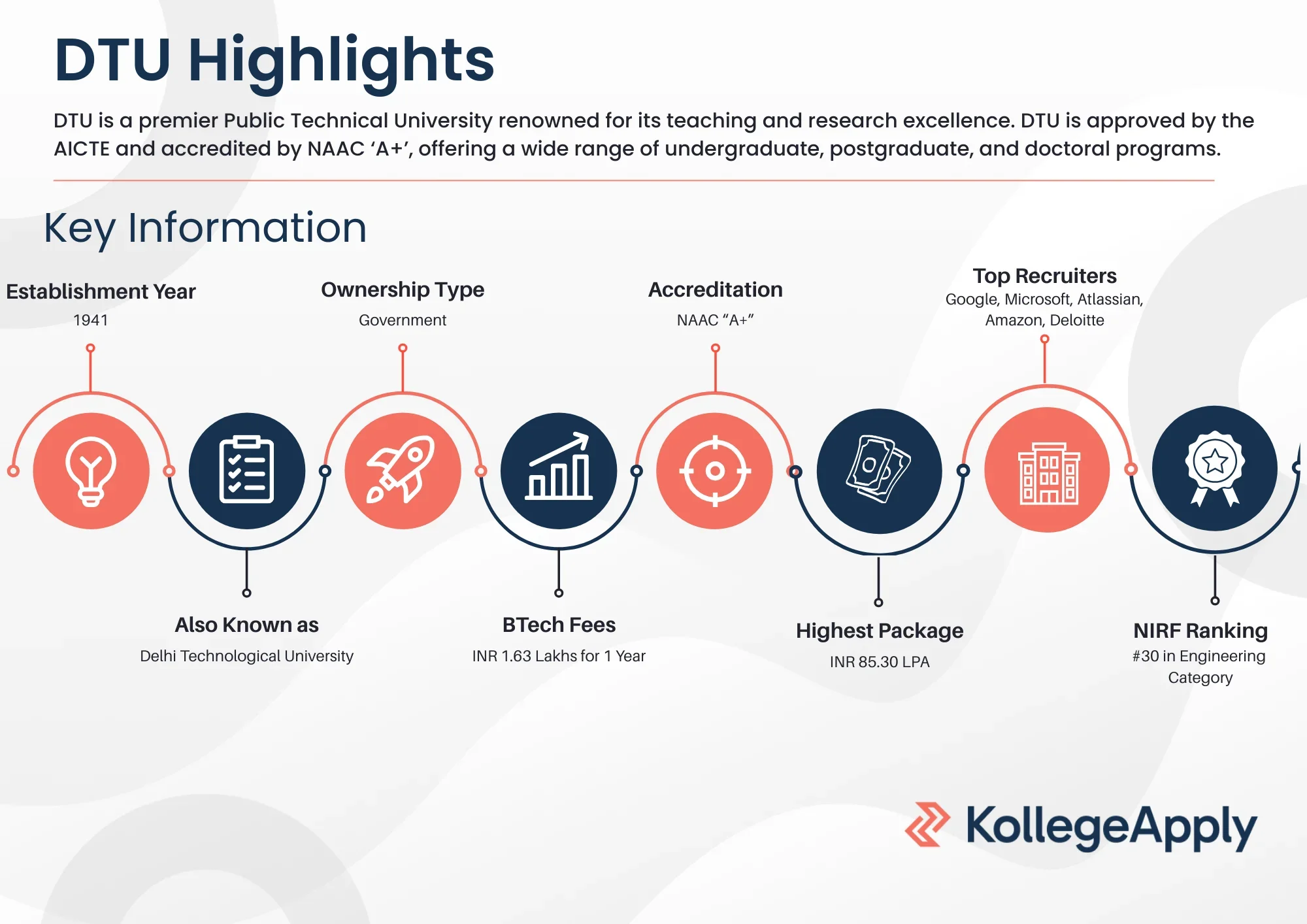 Delhi Technological University (DTU), New Delhi, was established in 1941 as Delhi Polytechnic, later renamed Delhi College of Engineering, and finally granted university status in 2009. Located in Shahbad Daulatpur, Rohini, North-West Delhi, DTU is a premier Public Technical University renowned for its teaching and research excellence. DTU is approved by the AICTE and accredited by NAAC ‘A+’, offering a wide range of undergraduate, postgraduate, and doctoral programs across engineering, management, sciences, design, and humanities.