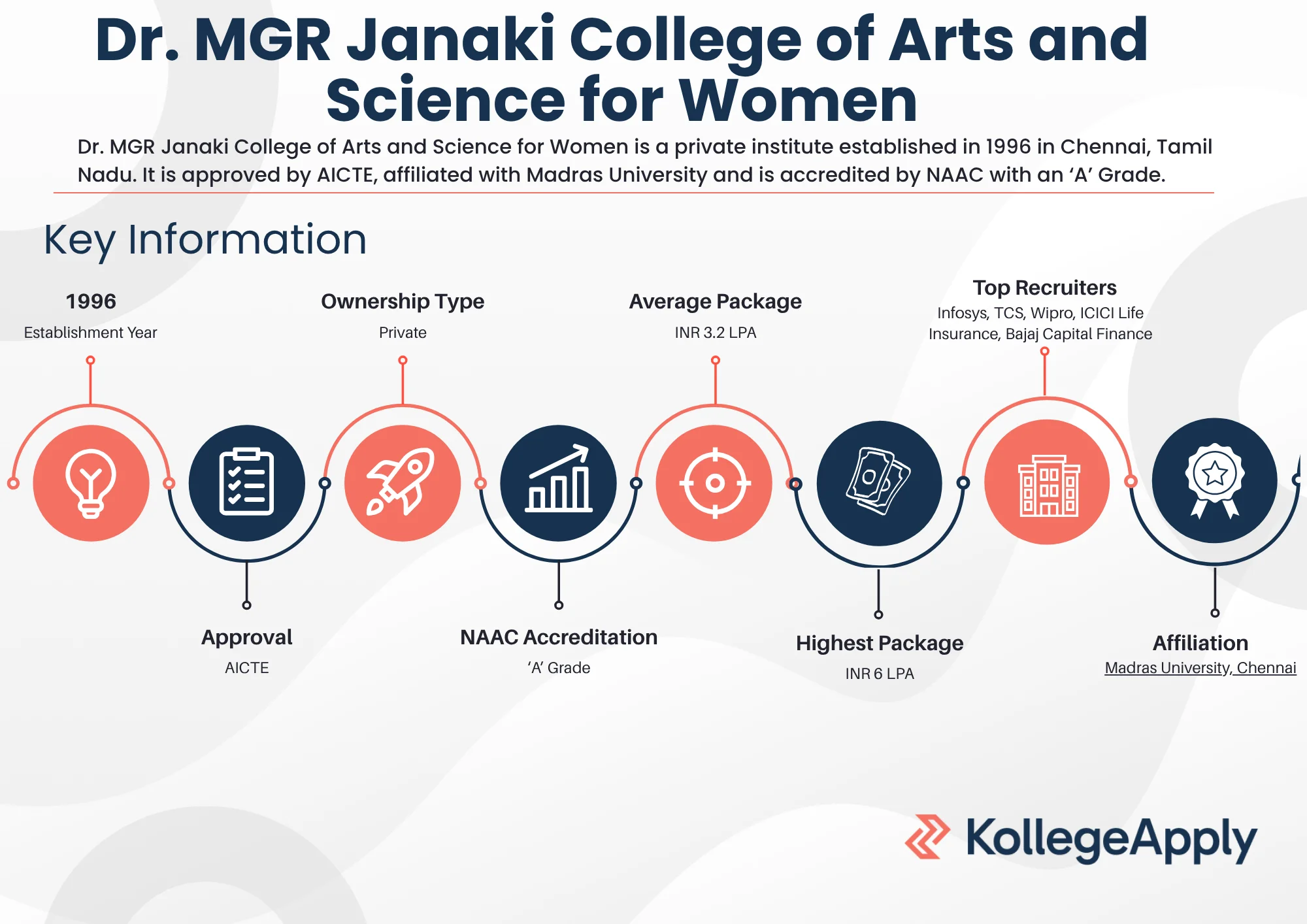 The institute is well-connected via Puratchi Thalaivar Dr. M.G. Ramachandran Central Railway Station, Chennai International Airport and National Highway 16. Further, Dr. MGR Janaki College of Arts and Science for Women maintains a strong placement record with top recruiters such as Episource (Optum), Infosys, TCS, Wipro, Sutherland, Omega Health Care, ICICI Life Insurance, Bajaj Capital Finance and Star Health. The highest package offered in 2023 was INR 6 LPA, while the average package stood at INR 3.2 LPA.