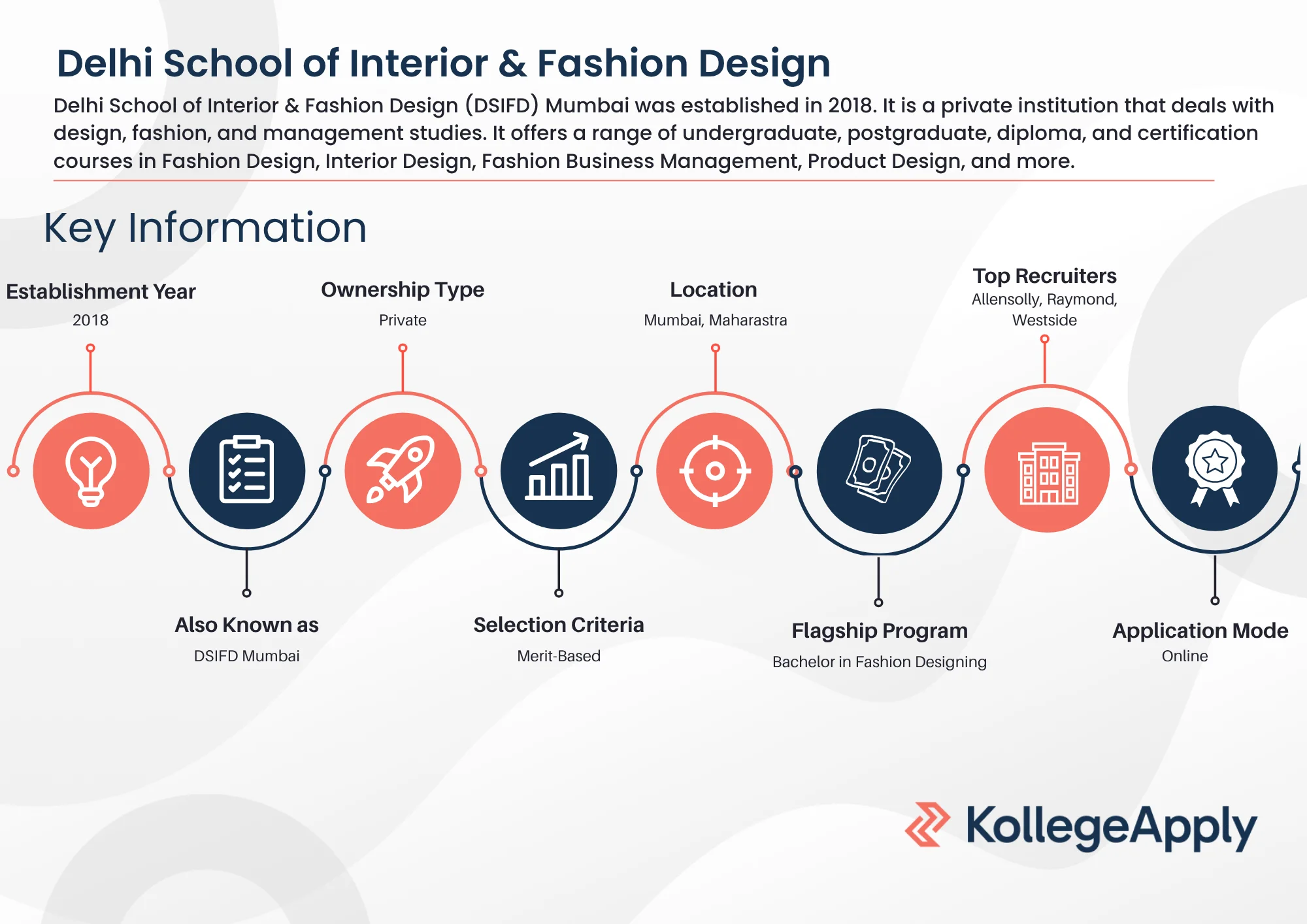 Delhi School of Interior & Fashion Design (DSIFD) Mumbai was established in 2018. It is a private institution that deals with design, fashion, and management studies. It provides numerous undergraduate, postgraduate, diploma, and certification courses in Fashion Designing, Interior Designing, Fashion Business Management, Product Design, etc. The flagship course is Bachelor in Fashion Designing. To enrol in undergraduate courses, students should have completed 10+2 with a minimum of 50% marks.
