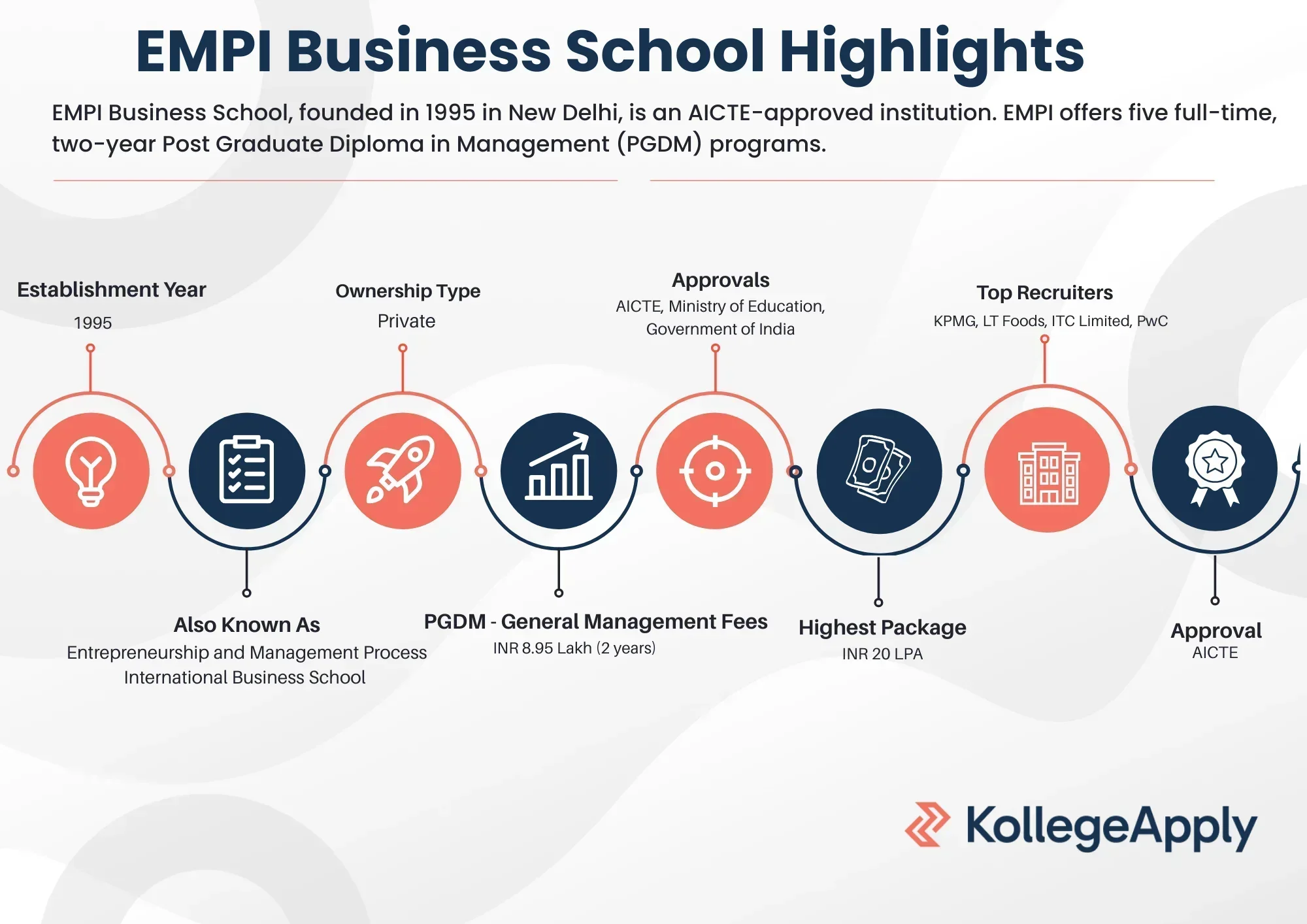EMPI Business School, New Delhi, founded in 1995, is an AICTE-approved institution. EMPI offers five full-time, two-year Post Graduate Diploma in Management (PGDM) programs with specializations in General Management (Marketing & Finance), Advertising & Communication, International Business, Human Resource Management, and Research & Business Analytics. The flagship PGDM in General Management program fees is INR 8.95 lakh (2 years).