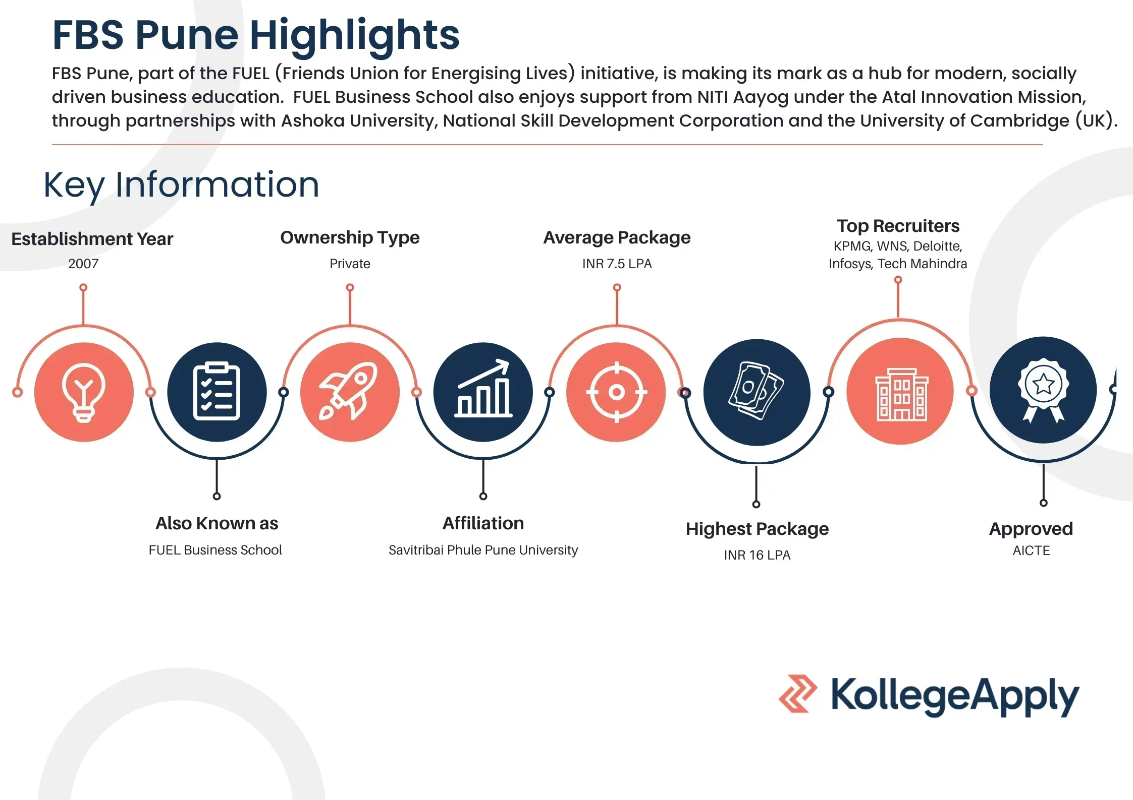 FUEL Business School (FBS) in Pune, under the FUEL (Friends Union for Energising Lives) initiative, stands out as a socially conscious hub for business education. Affiliated with Savitribai Phule Pune University and AICTE-approved, it partners with NITI Aayog's Atal Innovation Mission, Ashoka University, NSDC India, and the University of Cambridge (UK). Offering courses such as PGDM and PGDM in CSG & ESG, FBS boasts the highest package of INR 16 LPA from recruiters like Oracle, HSBC, KPMG, and Wipro.