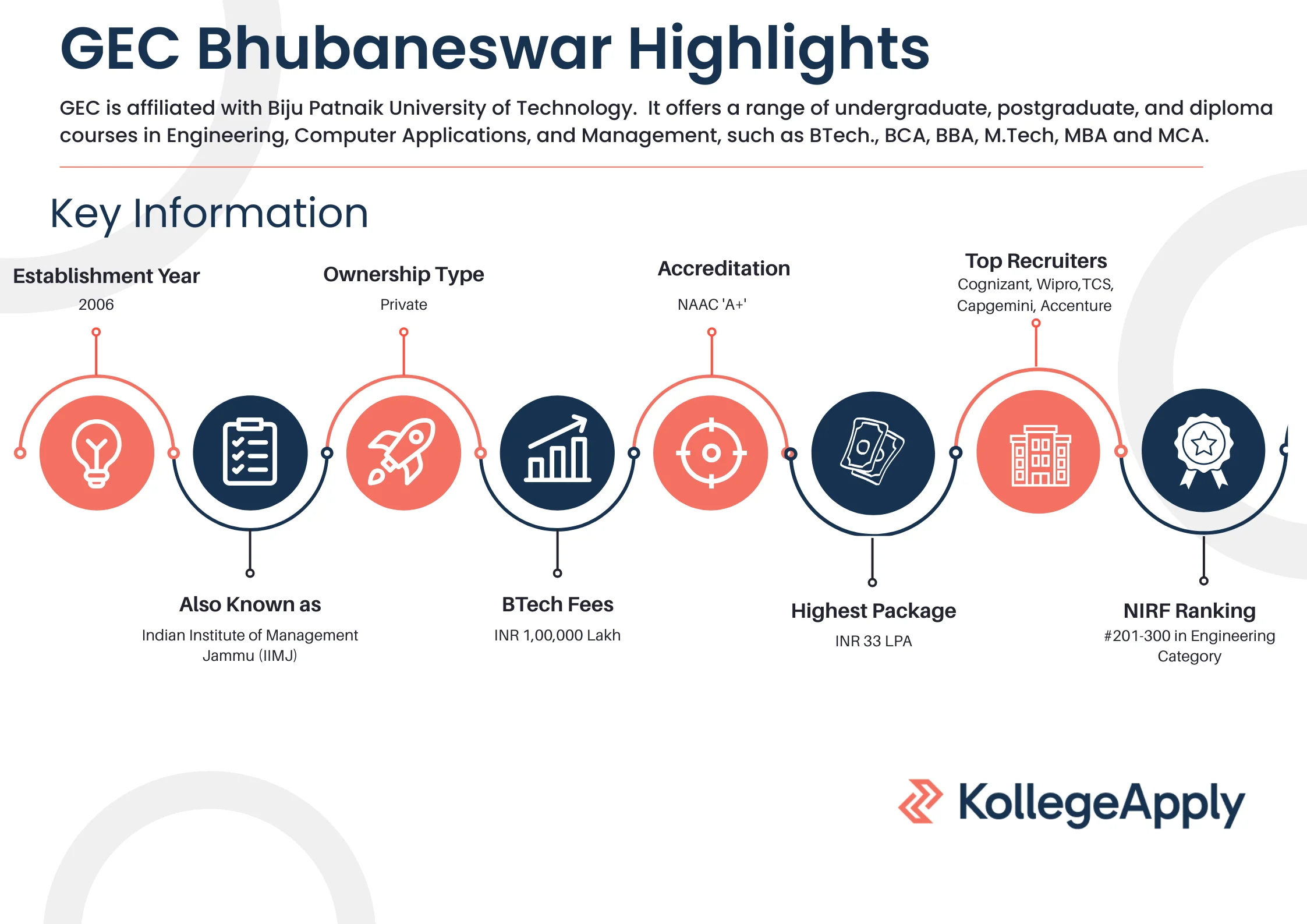 GEC Bhubaneswar was established in 2006 and is affiliated with Biju Patnaik University of Technology, accredited with an 'A' Grade by NAAC, and approved by AICTE.