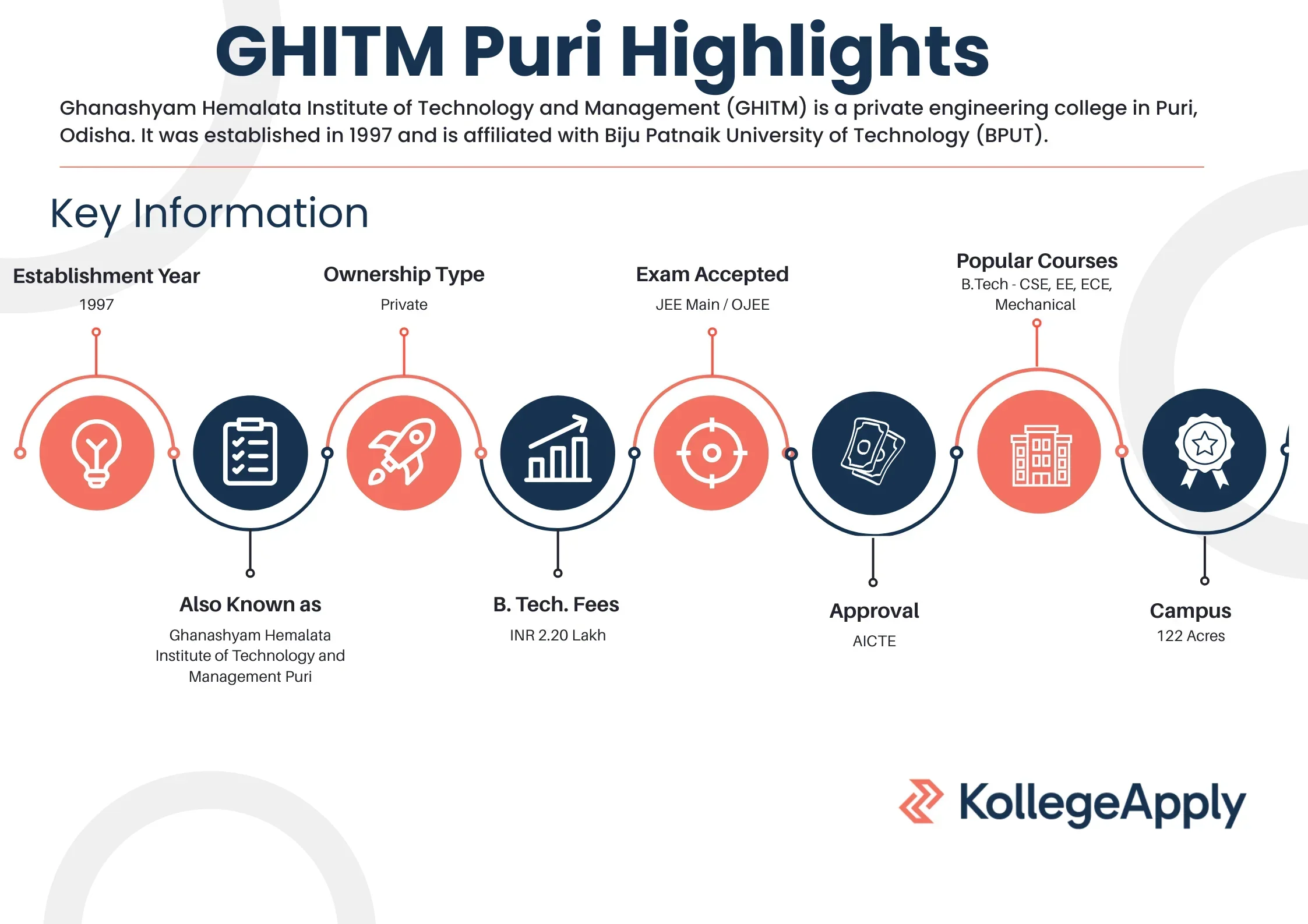Ghanashyam Hemalata Institute of Technology and Management (GHITM) is a private engineering college in Puri, Odisha. It was established in 1997 and is affiliated with Biju Patnaik University of Technology (BPUT). The institute is approved by the All India Council for Technical Education (AICTE) and offers undergraduate BE/B.Tech programs in core branches. Its rural campus spans around 122 acres, providing a focused environment for technical education. The flagship B.Tech courses cost around INR 2.20 Lakh for the full duration for many branches. On the placement front, GHITM has recorded the highest package of INR 9 LPA, with top recruiters including Wipro, TVS Group, Zycus, SYNTEL, Cummins, Compro Technology, Triple A Solutions, and Artech. The college also provides scholarships, especially merit-cum-means support for deserving students.
