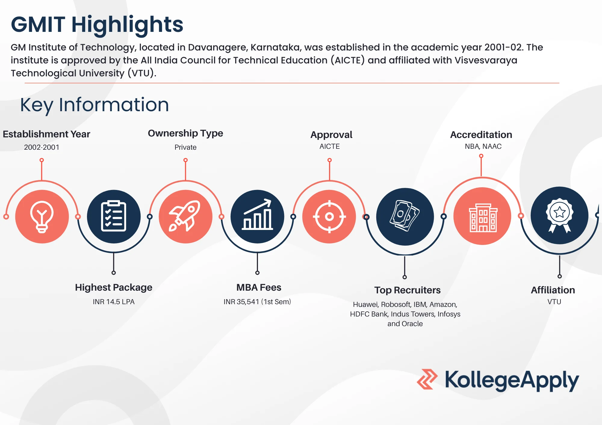 The institute is well-connected by train, air and road through Davangere Railway Station, Kempegowda International Airport and NH48. Further, GM Institute of Technology maintains a strong placement record with top recruiters including Huawei, Robosoft, IBM, Amazon, HDFC Bank, Indus Towers, Infosys and Oracle. The highest package offered in 2024 was INR 14.5 LPA, while the average package stood at INR 3 LPA.