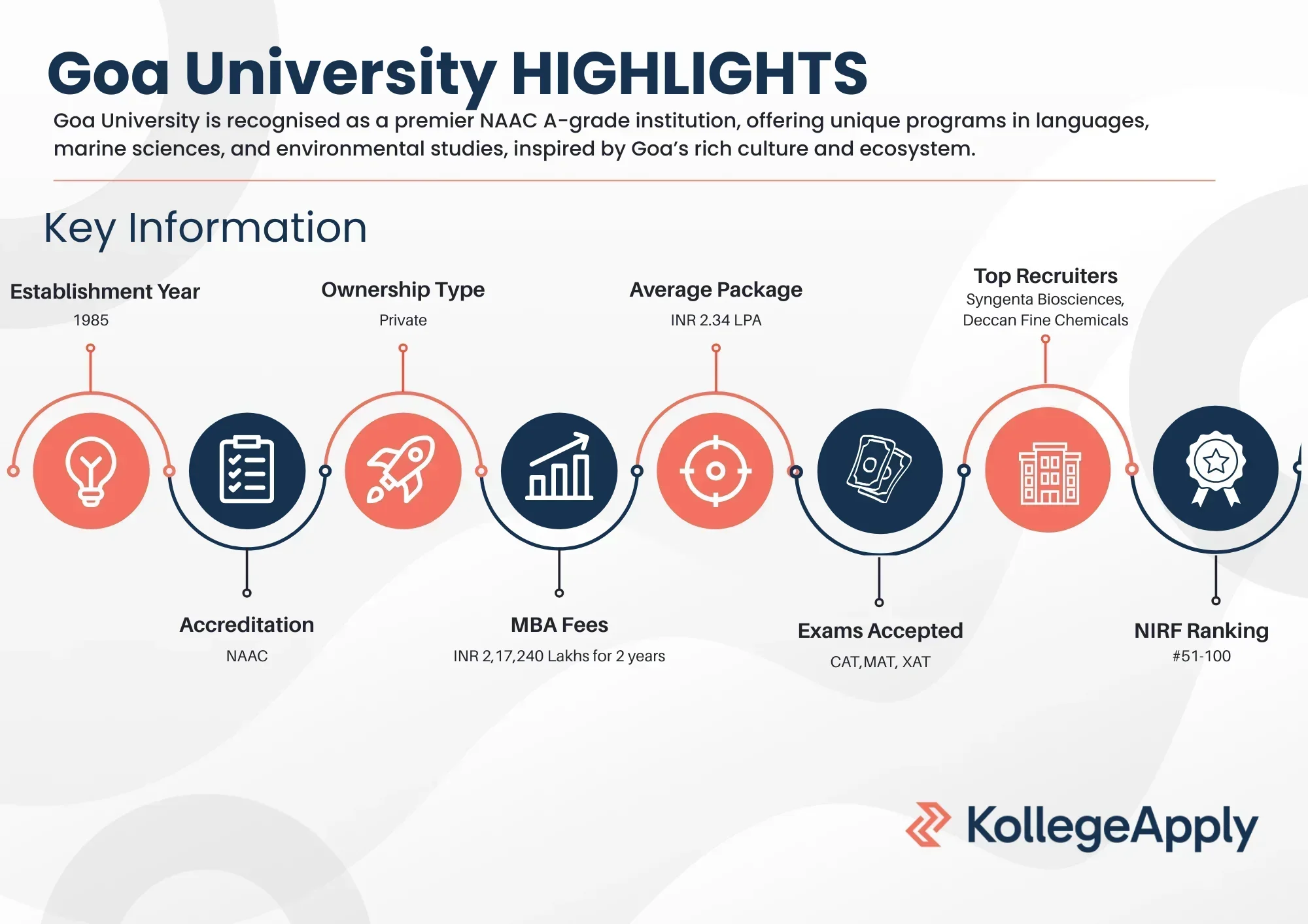 Goa University admissions are conducted through both merit and entrance examinations. The university also conducts in-house entrance examinations such as GU-ART, GU-QET, and GU-CLAT for postgraduate courses. It also accepts CAT, MAT, XAT, CMAT and ATMA scores for specific courses such as MBA. Undergraduate, postgraduate and doctoral-level courses are run either at the campus or through affiliated colleges. The different stages of the admission process have been tabulated below: