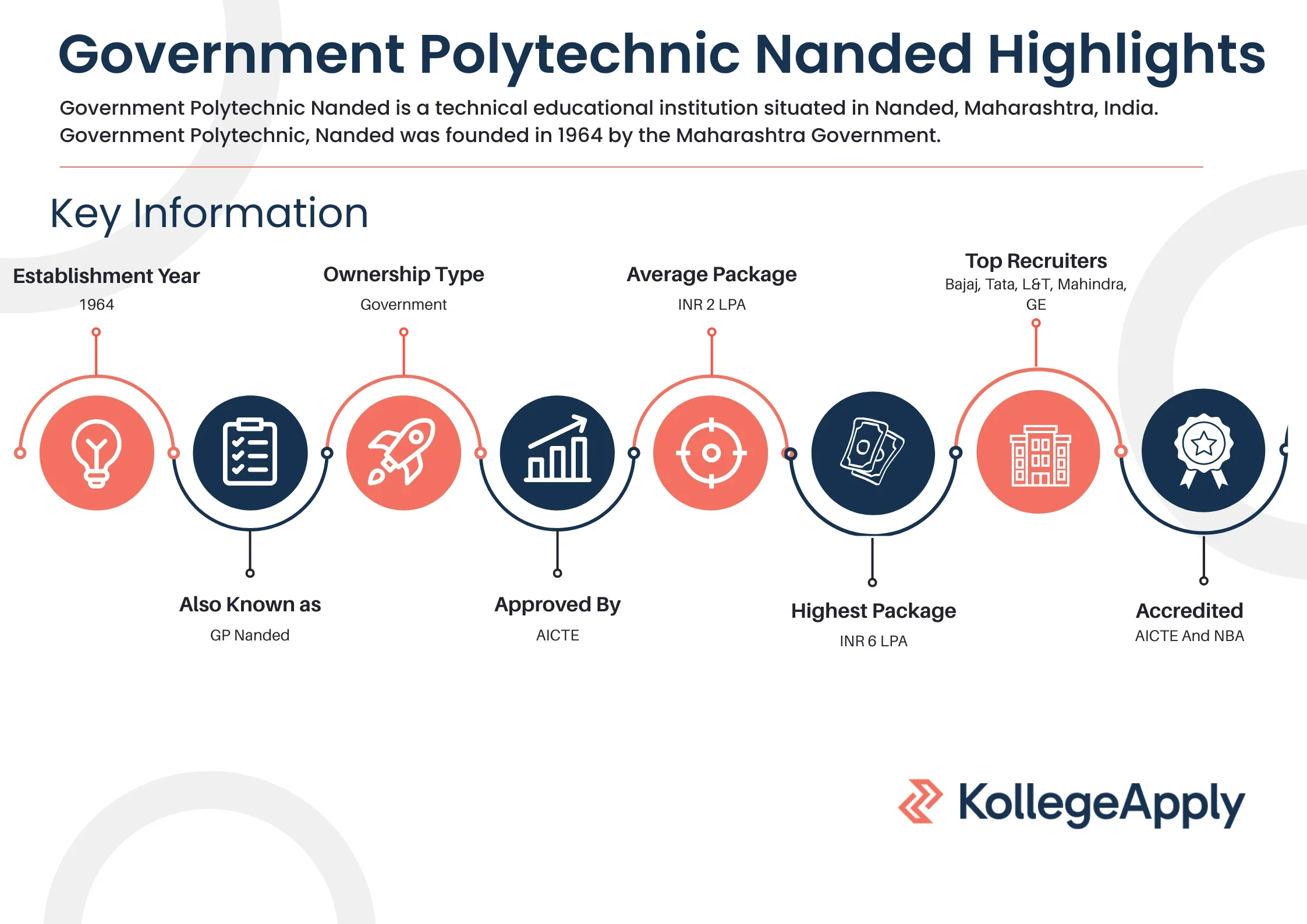 Government Polytechnic Nanded is a technical educational institution situated in Nanded, Maharashtra, India. Government Polytechnic, Nanded was founded in 1964 by the Maharashtra Government under the administration of the Director of Technical Education (M.S) Mumbai. Government Polytechnic Nanded is affiliated to Maharashtra State Board of Technical Education (MSBTE). Renowned for its dedication towards offering quality education in the areas of engineering and technology, Government Polytechnic, Nanded has emerged as a leading hub for skill development and vocational training. The Government Polytechnic, Nanded provides a comprehensive array of diploma courses in several branches of engineering. Some of the courses conducted by the institute are Diploma in Civil Engineering, Diploma in Mechanical Engineering, Diploma in Electrical Engineering, Diploma in Medical Electronics, Diploma in Product Engineering and Diploma in Information Technology.