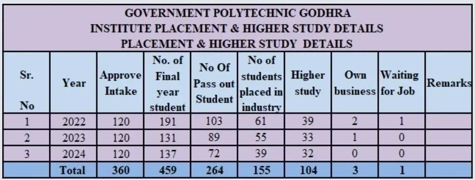 Government Polytechnic Godhra maintains an active placement cell, organising interviews, industrial visits, workshops, and soft skills training. The highest packages reach up to INR 15 LPA, with the lowest around INR 2 LPA and the average near INR 4.5 LPA for mechanical students.