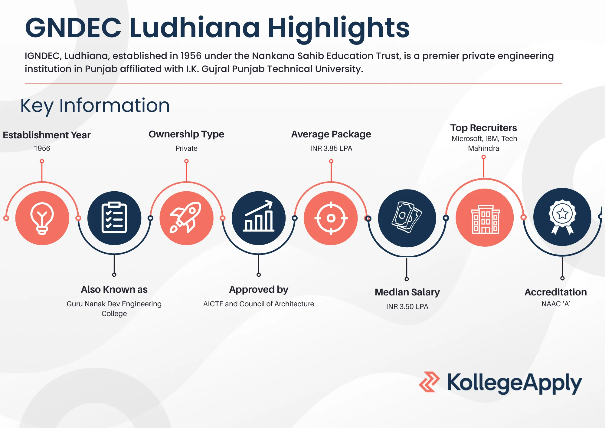Guru Nanak Dev Engineering College (GNDEC), Ludhiana, established in 1956 under the Nankana Sahib Education Trust, is a premier private engineering institution in Punjab affiliated with I.K. Gujral Punjab Technical University. Accredited with an 'A' grade by NAAC and approved by AICTE and Council of Architecture (CoA), GNDEC offers full-time and part-time programs, including B.Tech, M.Tech, MBA, MCA, B.Arch, and PhD across various specializations such as IT, Structural Engineering, Environmental Engineering, and VLSI Design. Admissions are based on JEE Main (B.Tech), GATE (M.Tech), and CMAT (MBA) scores. The college boasts a robust placement record with top recruiters like Microsoft, IBM, and Tech Mahindra. GNDEC Ludhiana has a well-equipped campus features hostels, sports complexes, a library, and modern facilities supporting academic and holistic student development.