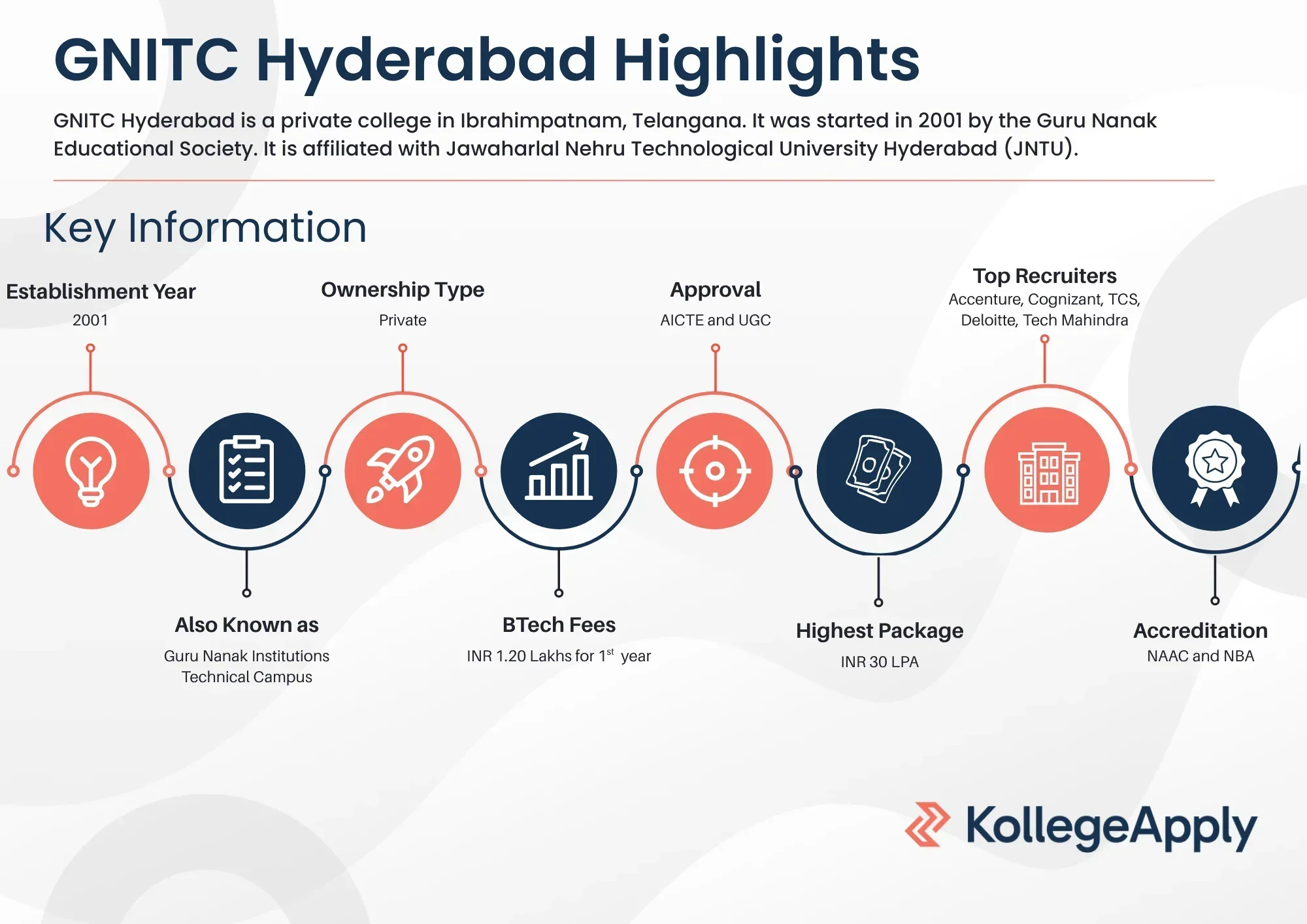 GNITC offers complete placement assistance with top recruiters like Accenture, Cognizant, TCS, Deloitte, Tech Mahindra, Infosys, Wipro, Amazon, and Mu Sigma. For the 2024–25 batch, the highest package was INR 30 LPA. The campus is spread over 31.46 acres. Facilities here include smart classrooms, laboratories, seminar halls, a cafeteria, a library, hostels and sports areas.