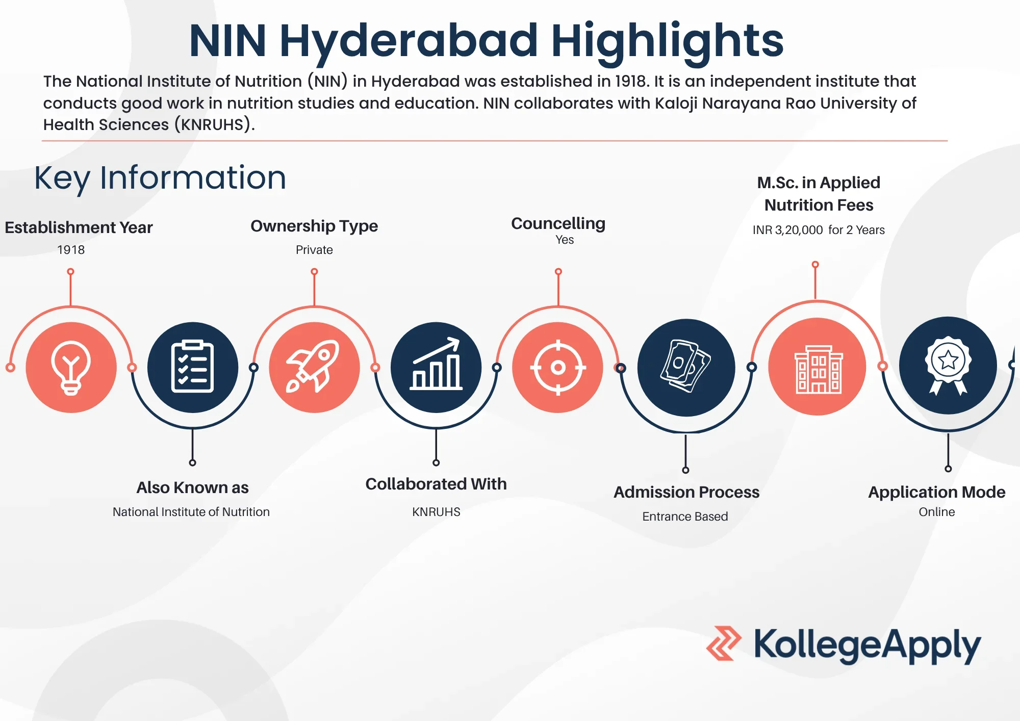 For NIN Hyderabad Admission 2025, candidates must check eligibility and course details from the official website. Admission occurs through the AP-PGMET entrance exam by KNR University of Health Sciences. Eligible candidates with a minimum of 55% marks need to register and appear for the test. Meritorious candidates based on marks participate in centralised counselling with documents as required. Admission is finalised on seat allotment, payment of fees, and formalities as per NIN or university regulations.