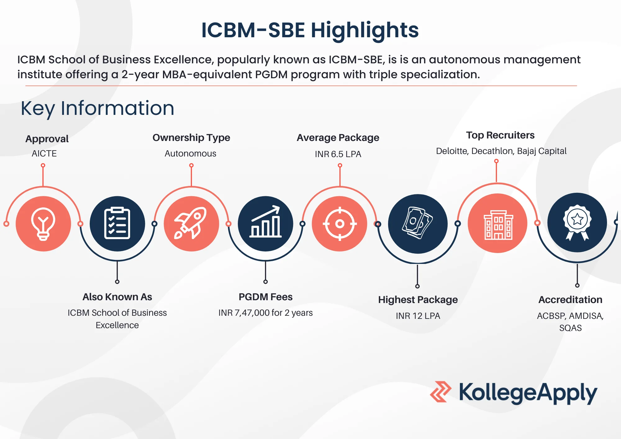 ICBM School of Business Excellence Hyderabad offers a 2-year AICTE-approved and AIU-recognized MBA-equivalent PGDM program with Triple Specialization in Marketing, Finance, HR, etc. Admission is based on CAT, XAT, CMAT, ATMA, MAT, GMAT or state-level exams, followed by GD/PI and academic evaluation. The total PGDM fee is INR 7,47,000 for 2 years.