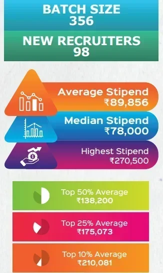 Summer internships for the 2024–26 batch had 100% placement with 356 students placed. The highest stipend was INR 2.70 lakh, and top sectors included Manufacturing, BFSI, and Consulting.