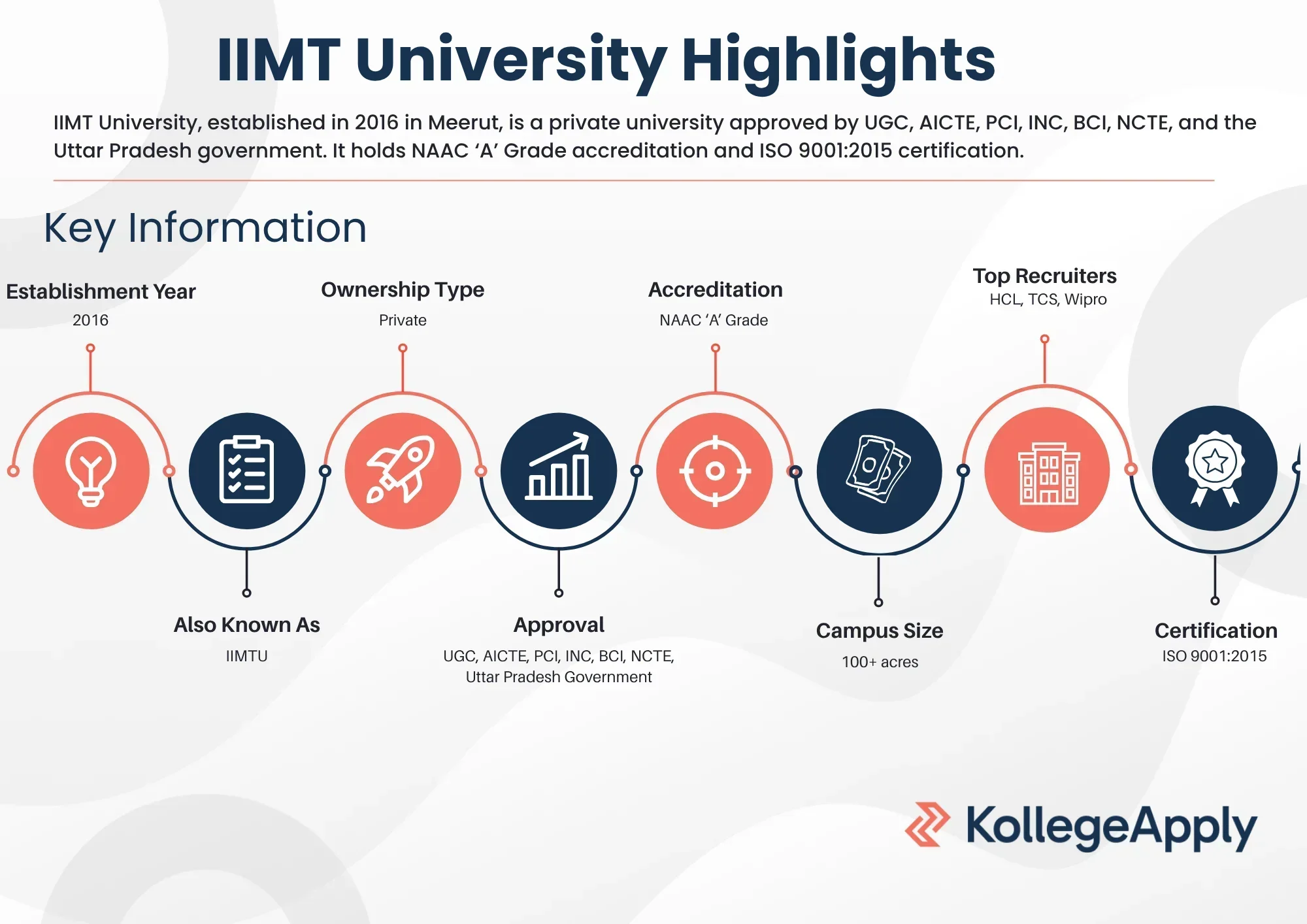IIMT University, established in 2016 in Meerut, is a private university approved by UGC, AICTE, PCI, INC, BCI, NCTE, and the Uttar Pradesh government. It holds NAAC ‘A’ Grade accreditation and ISO 9001:2015 certification. Spread across 100+ acres, the campus offers undergraduate (UG), postgraduate (PG) and diploma programs in engineering, pharmacy, nursing, management, law, agriculture, computer applications, and more. Admissions are merit-based, with eligibility criteria ranging from 40–50% marks in 10+2 for UG courses to 45–55% marks in graduation for PG courses. Fees vary between INR 28,300 and INR 2.1 lakh, depending on the program.