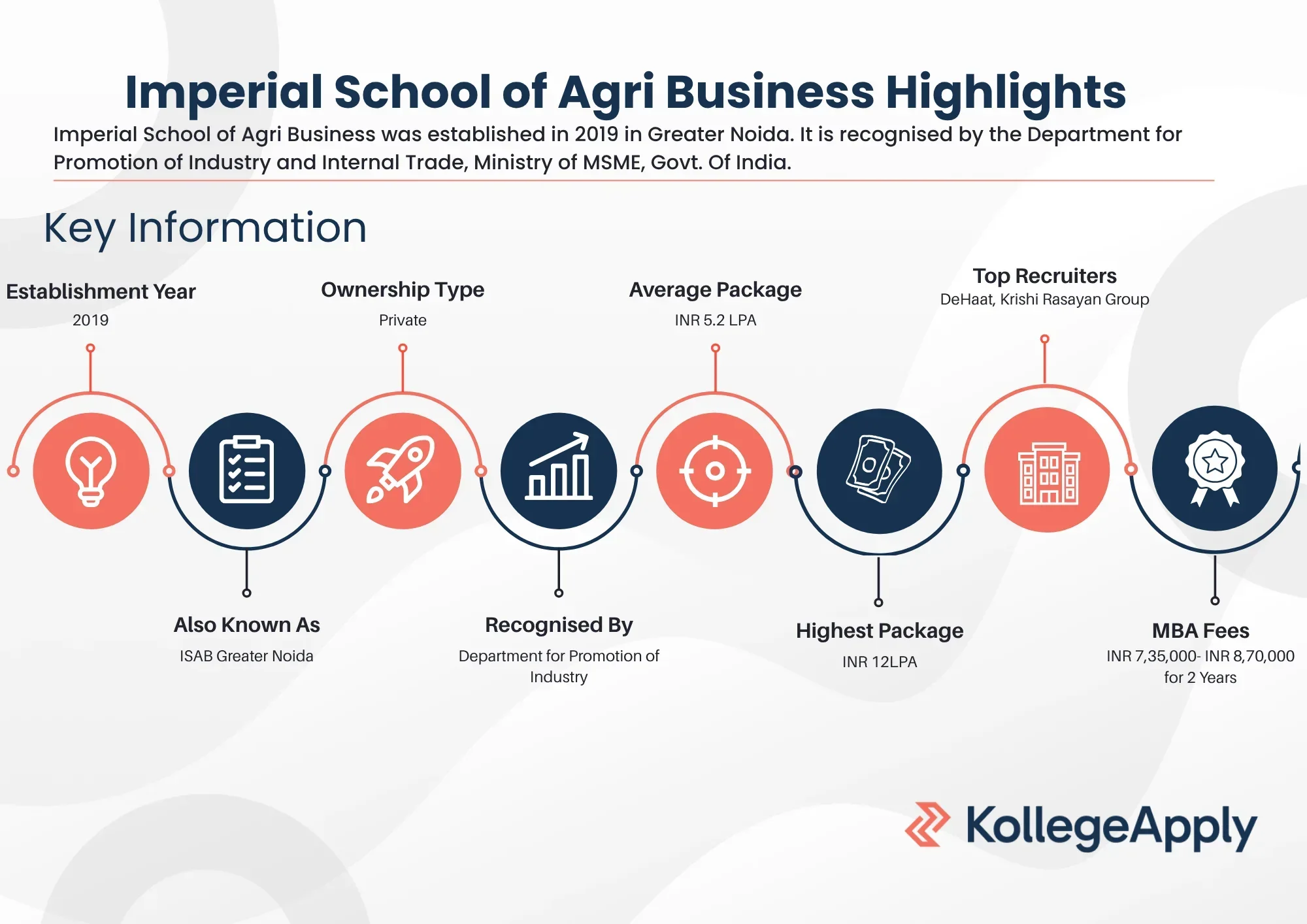 Established in 2019 in Greater Noida, Imperial School of Agri Business offers full-time postgraduate programs. It is recognised by the Department for Promotion of Industry and Internal Trade, Ministry of MSME, Govt. Of India. The institute is founded by GBPUAT Patnanagar and IIM Ahmedabad Alumni.