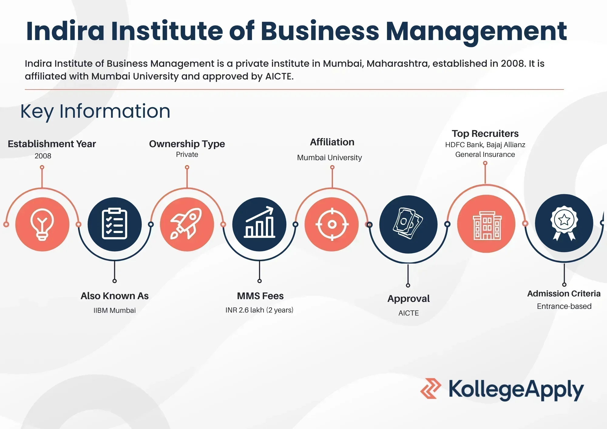Indira Institute of Business Management (IIBM) is a private institute in Mumbai, Maharashtra, established in 2008. It offers one postgraduate program, MMS under Mumbai University, and it is approved by AICTE. The institute provides MMS in five specialisations: Finance, Human Resources, IT & Systems, Operations, and Sales & Marketing, within the Management stream. The course fee is INR 2,60,000 for a duration of two years, and the total intake is 120 students. Admissions are based on merit and entrance exams, such as MAH MMS CET, CAT, MAT, XAT, ATMA or CMAT.