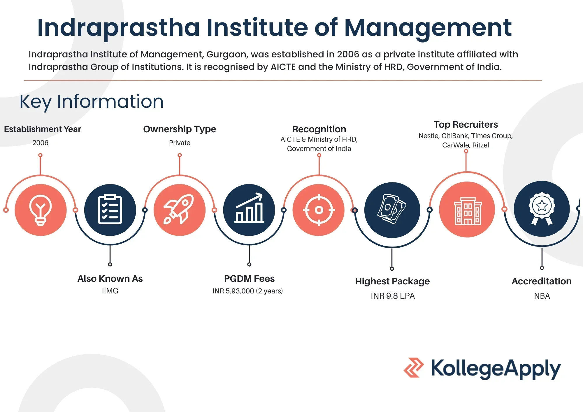 Indraprastha Institute of Management, Gurgaon, was established in 2006 as a private institute affiliated with Indraprastha Group of Institutions. The institute is recognised by the AICTE (All India Council for Technical Education) and the Ministry of HRD (Human Resource Development), Government of India. Additionally, the institute holds accreditation from the NBA (National Board of Accreditation).