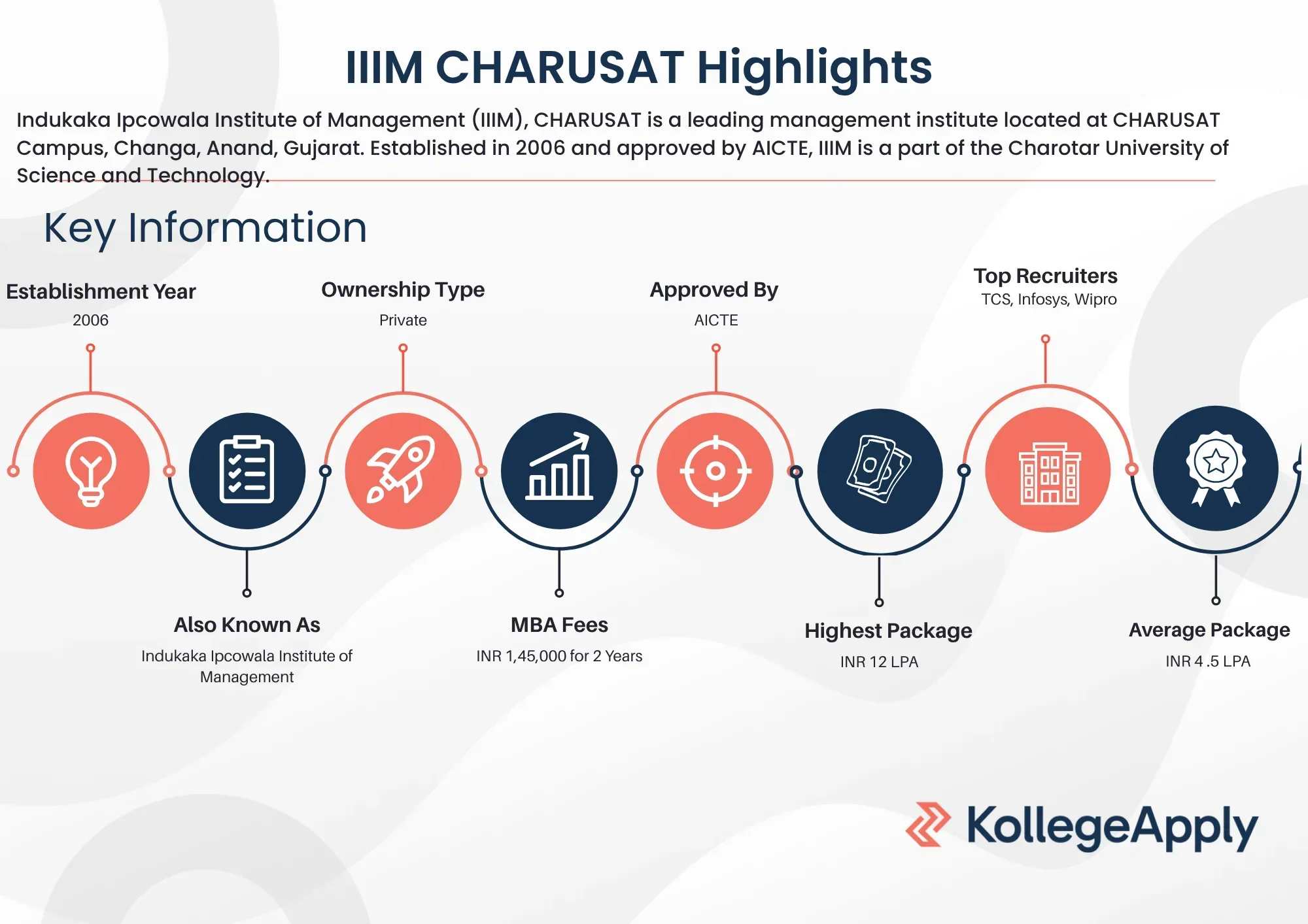 Indukaka Ipcowala Institute of Management (IIIM), CHARUSAT is a leading management institute located at the CHARUSAT Campus, Changa, Anand, Gujarat. Established in 2006 and approved by AICTE, IIIM is a part of the Charotar University of Science and Technology. The institute offers popular programs such as BBA, MBA, and M.Sc. in Management, with admission criteria based on academic merit. The highest salary package recorded in 2024 was INR 12 LPA, and the average MBA package was INR 4.5 LPA, with 86% of eligible students placed. Top recruiters include TCS, Asian Paints, HDFC Bank, ICICI Bank, Tech Mahindra, BMW, and DMart.